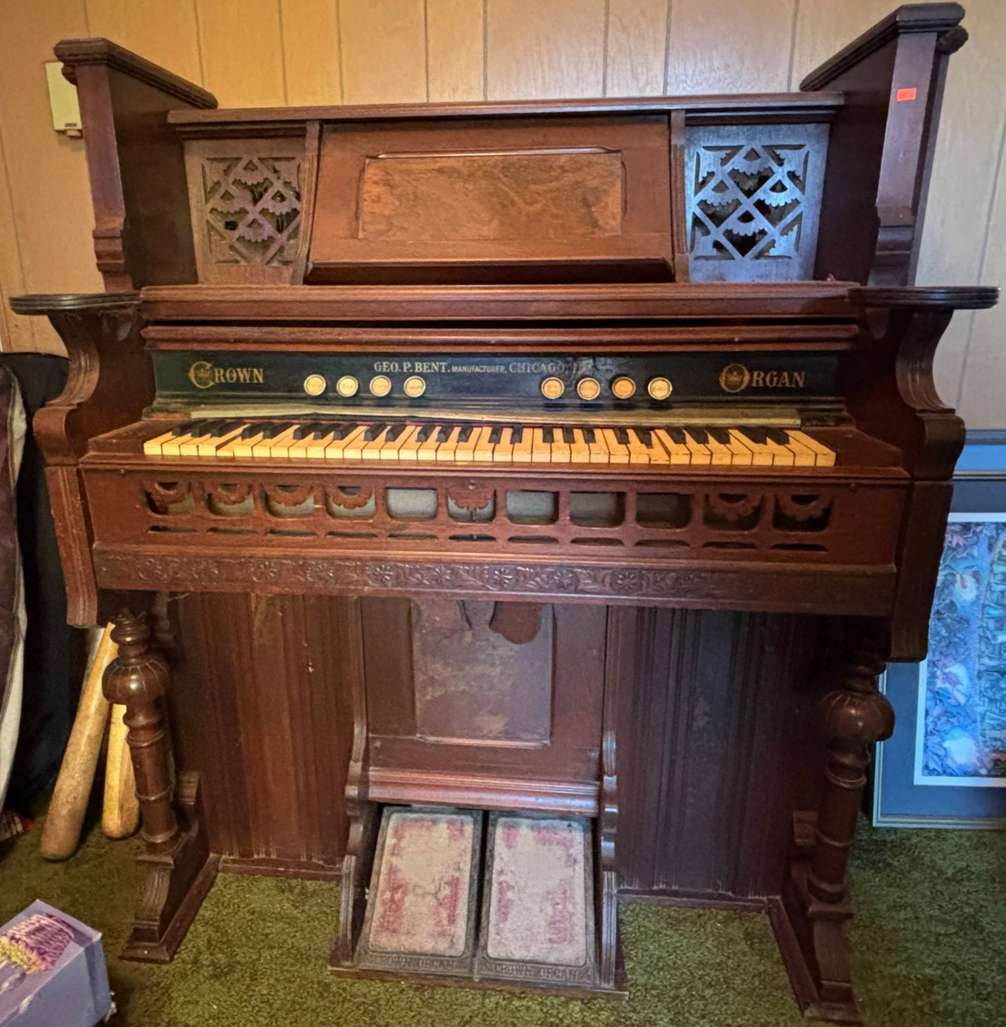209 Geo. P. Bent Crown Pump Organ with Foot Pedals & Ornate Detailing (Untested) 47.5” H x 51.2” L x 22.5” W