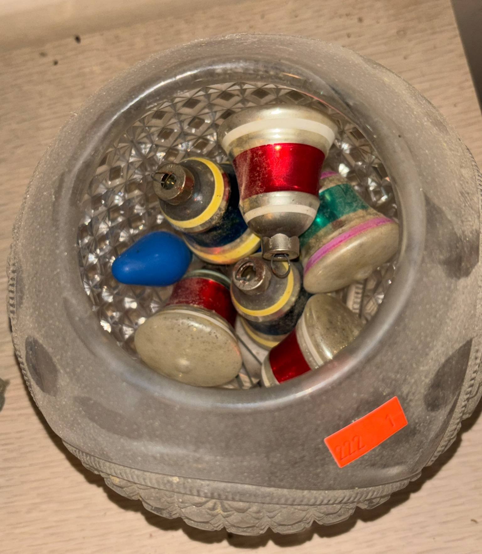 222 Faceted Glass Bowl with Plastic Christmas Bulbs 6.7”H