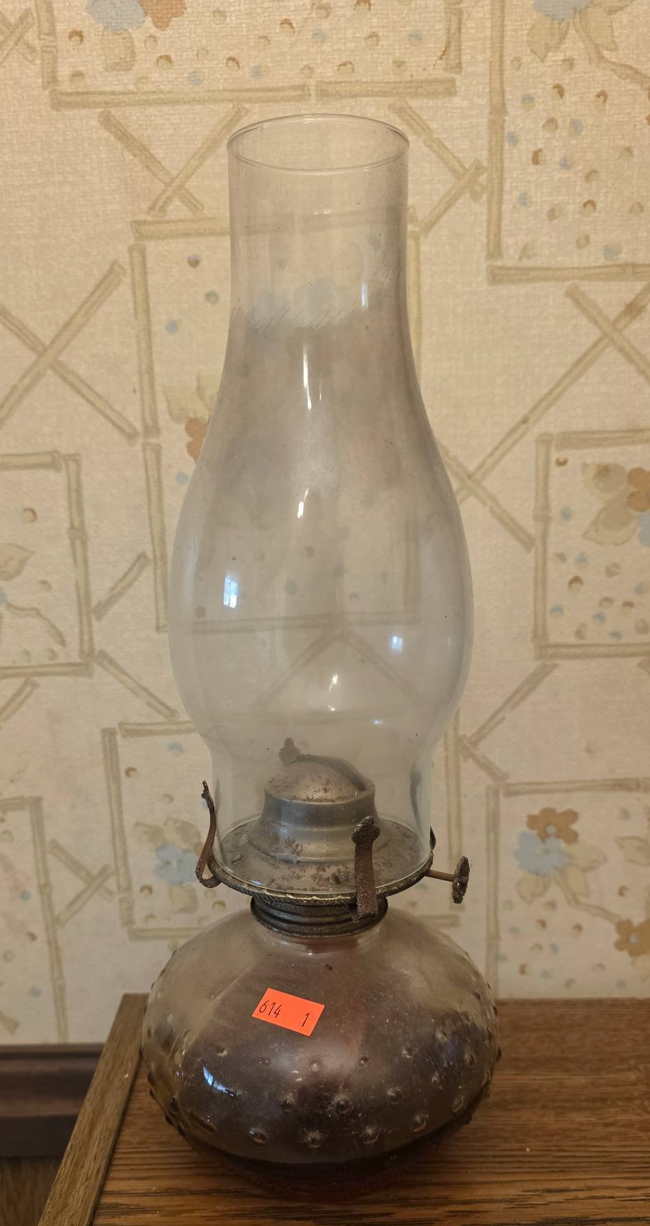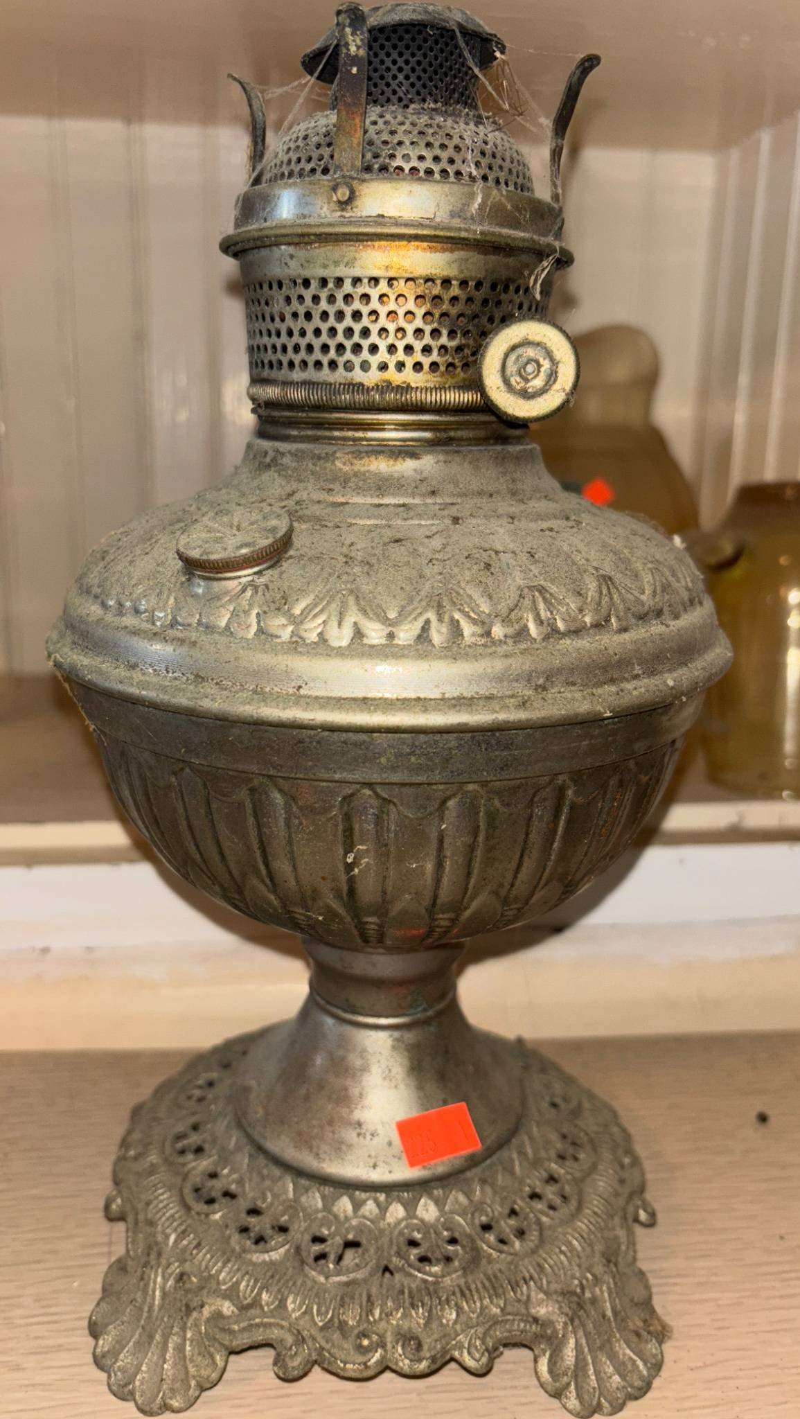 225 Metal Oil Lamp with Ornate Base & Decorative Perforations 13” H