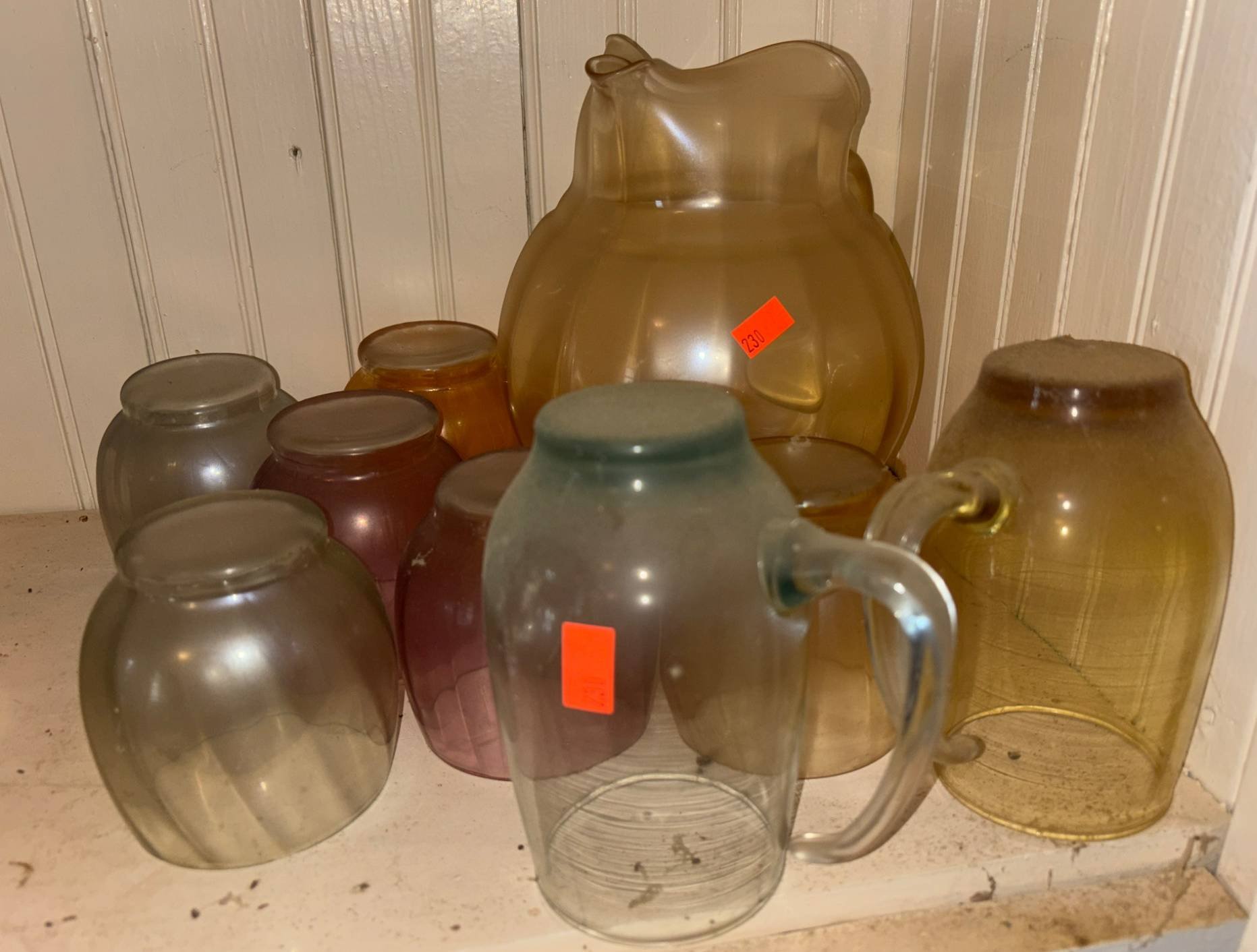 230 Iridescent Glass Pitcher with 8 Matching Glasses 4” – 10.5” H