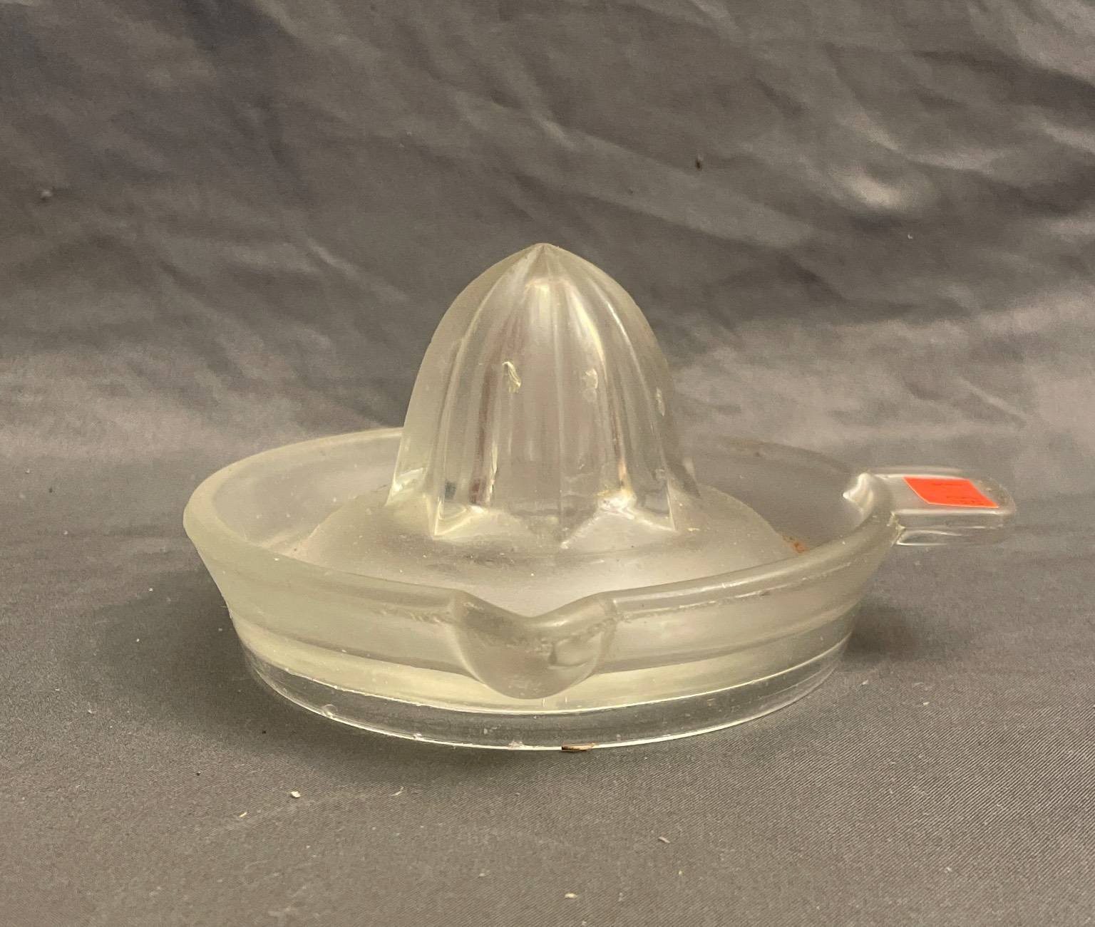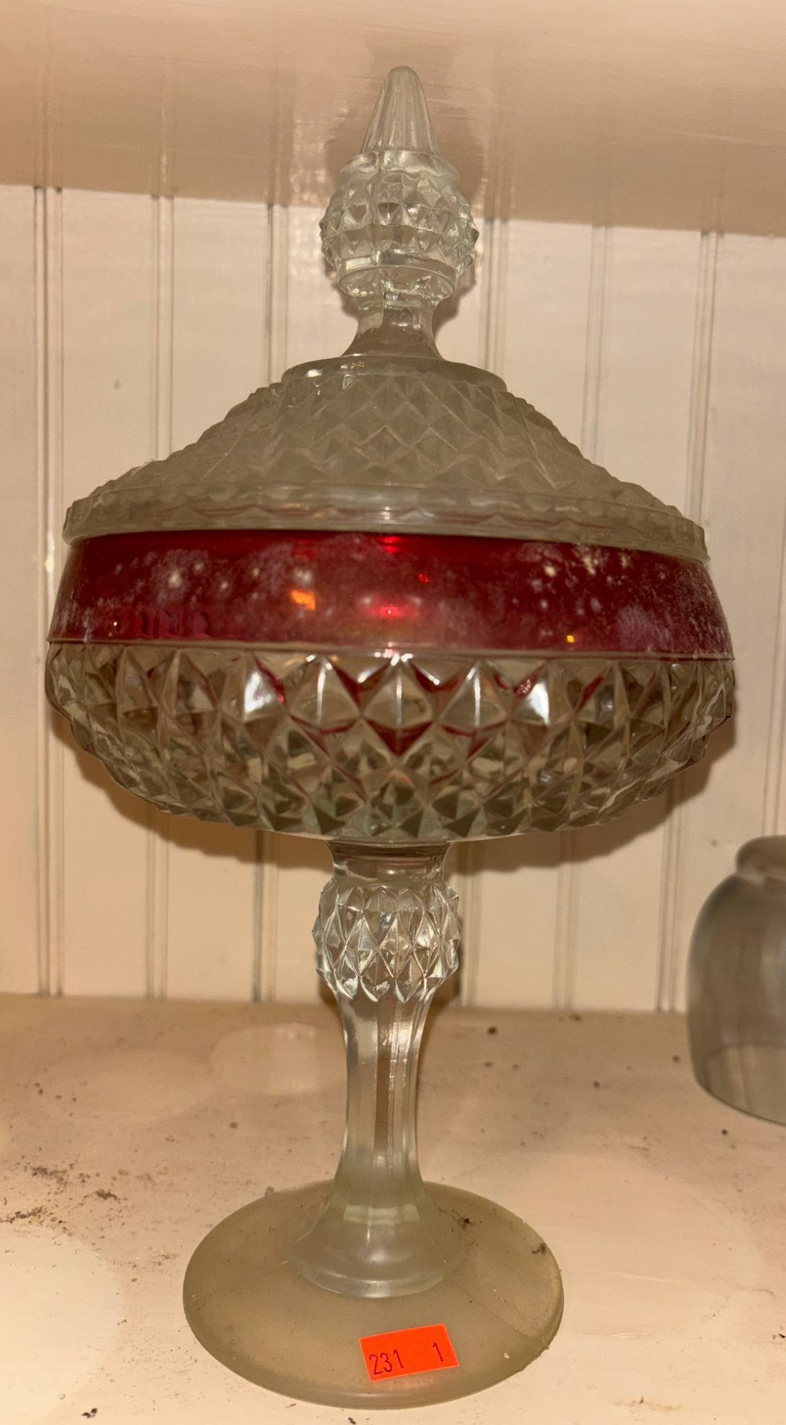 231 Indiana Glass Diamond Point Glass Compote Dish with Lid & Red Band Accent (Crack Visible on Lid) 12” H