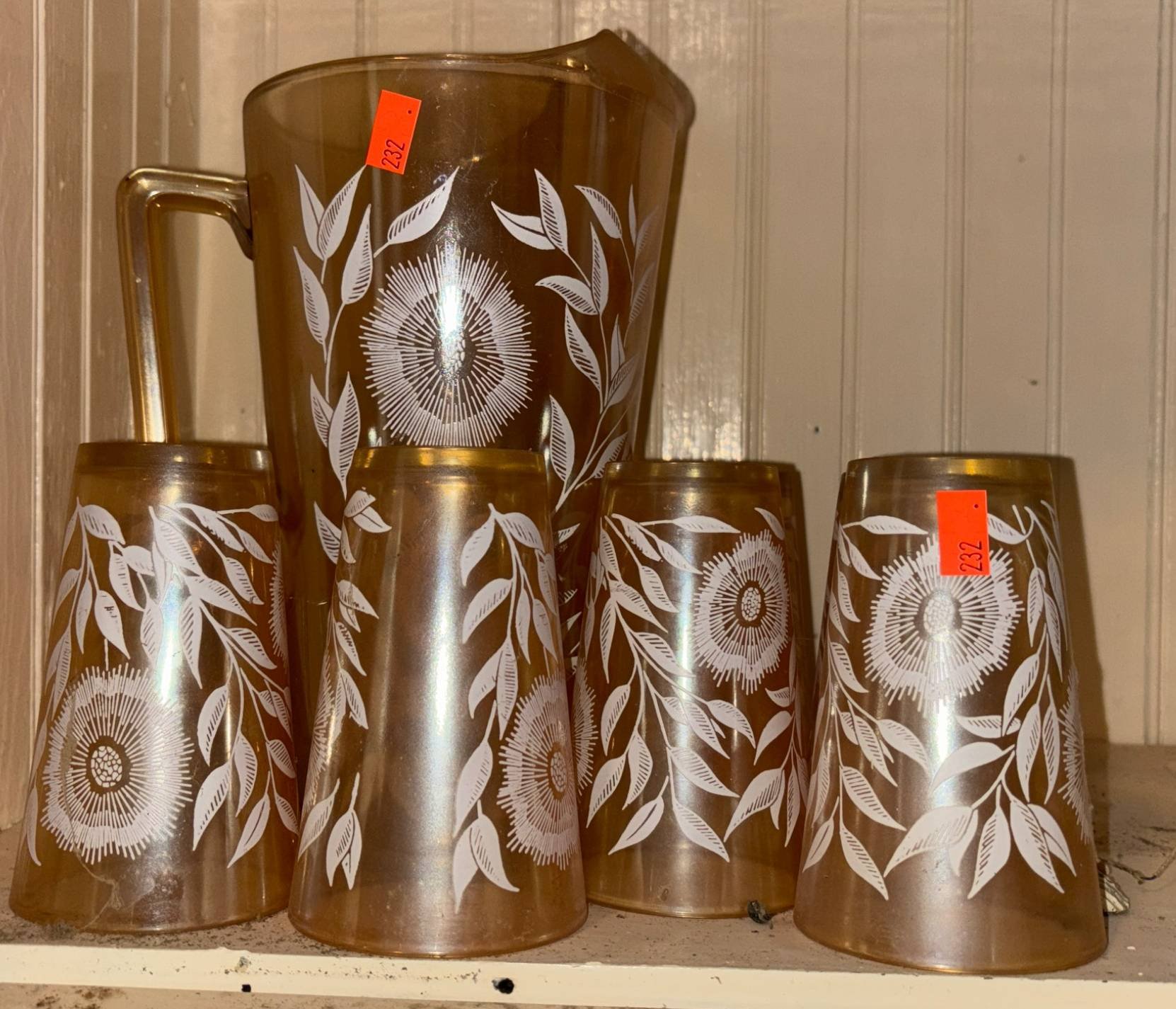 232 Gold-Colored Pitcher with 6 Matching Glasses and Floral Design 5” – 9” H