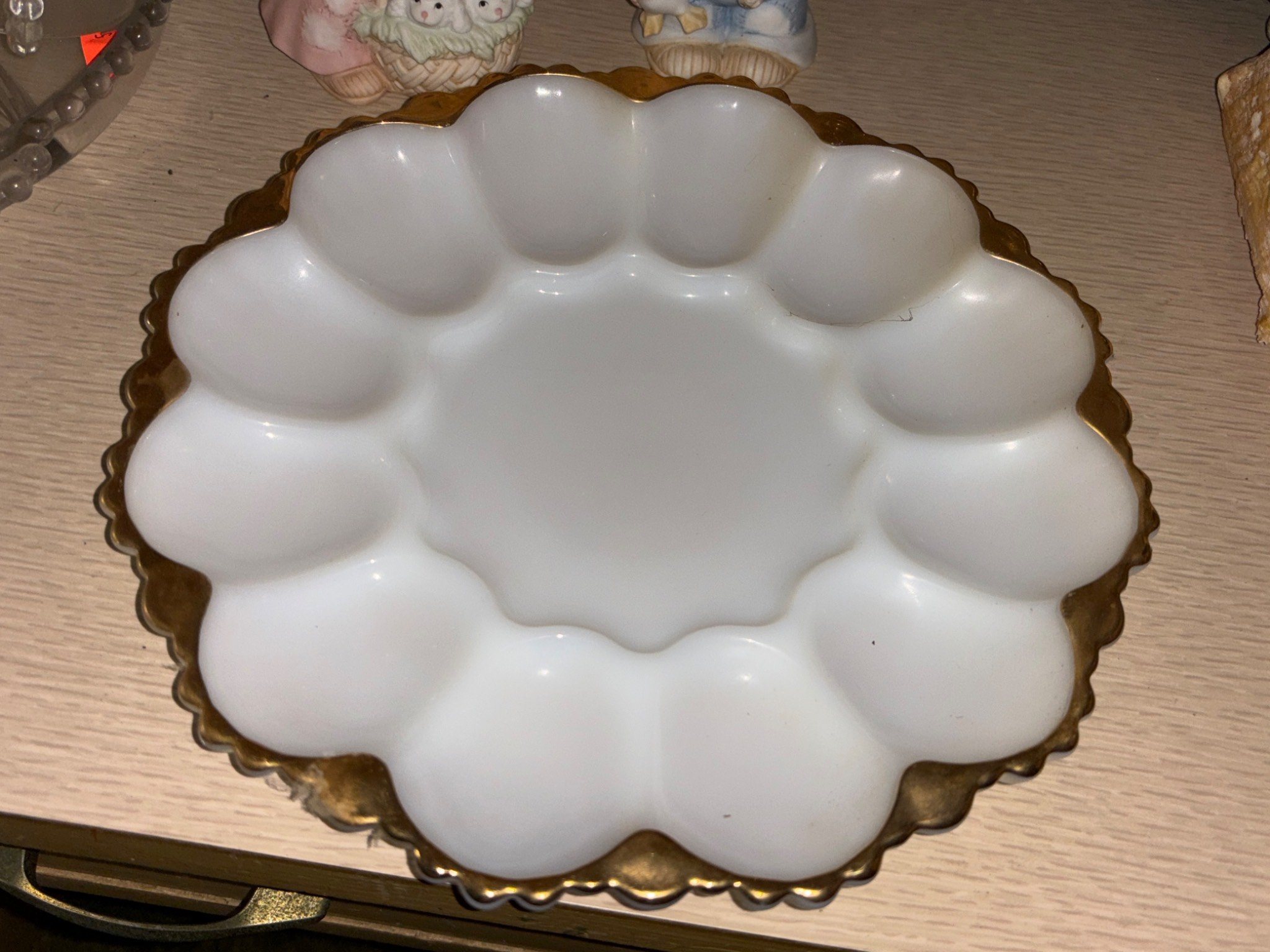 235 White Milk Glass Dish With Scalloped Gold-Tone Trimmed Edge 10” Diameter