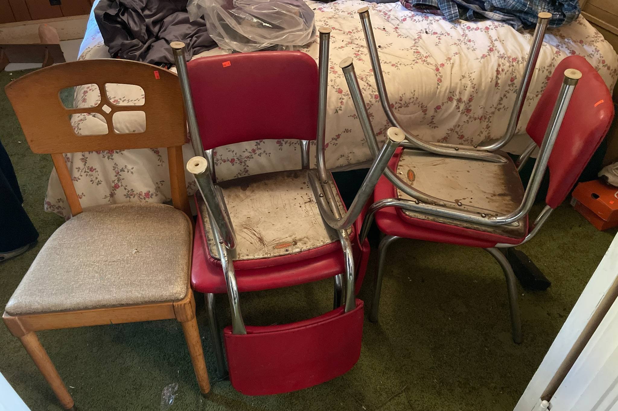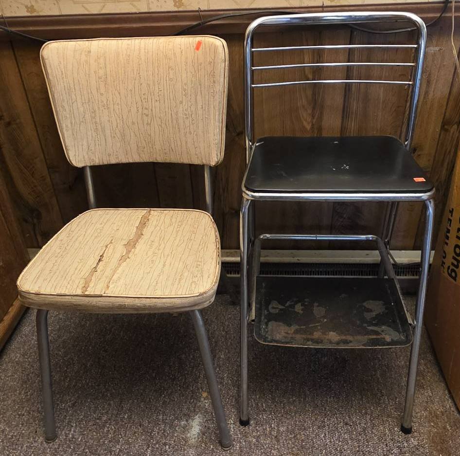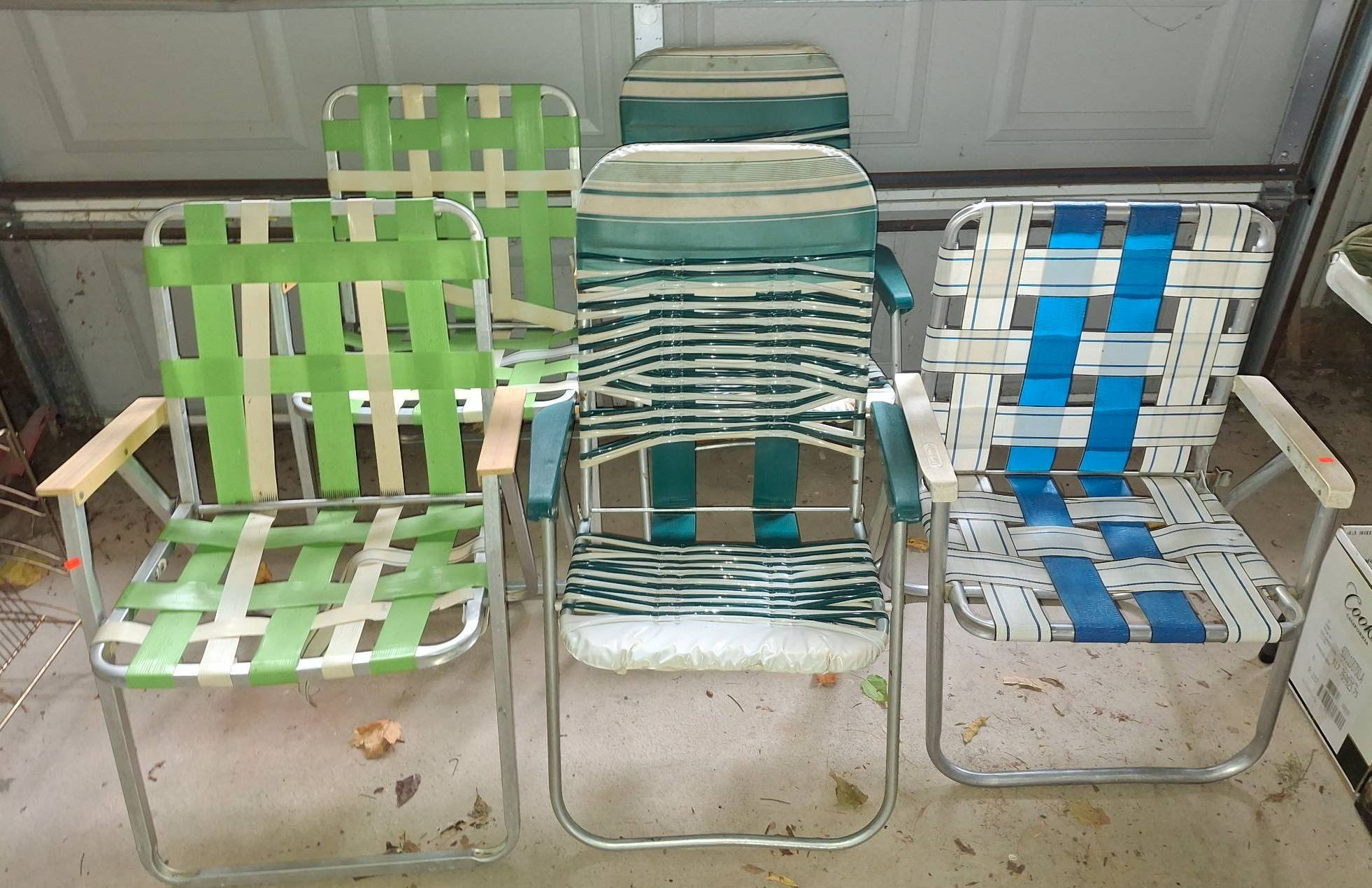 905 5 Aluminum Folding Chairs with Webbed and Vinyl Seating 22?x22?x32? – 21?x17?x34? (some seats burned or broken webbing)