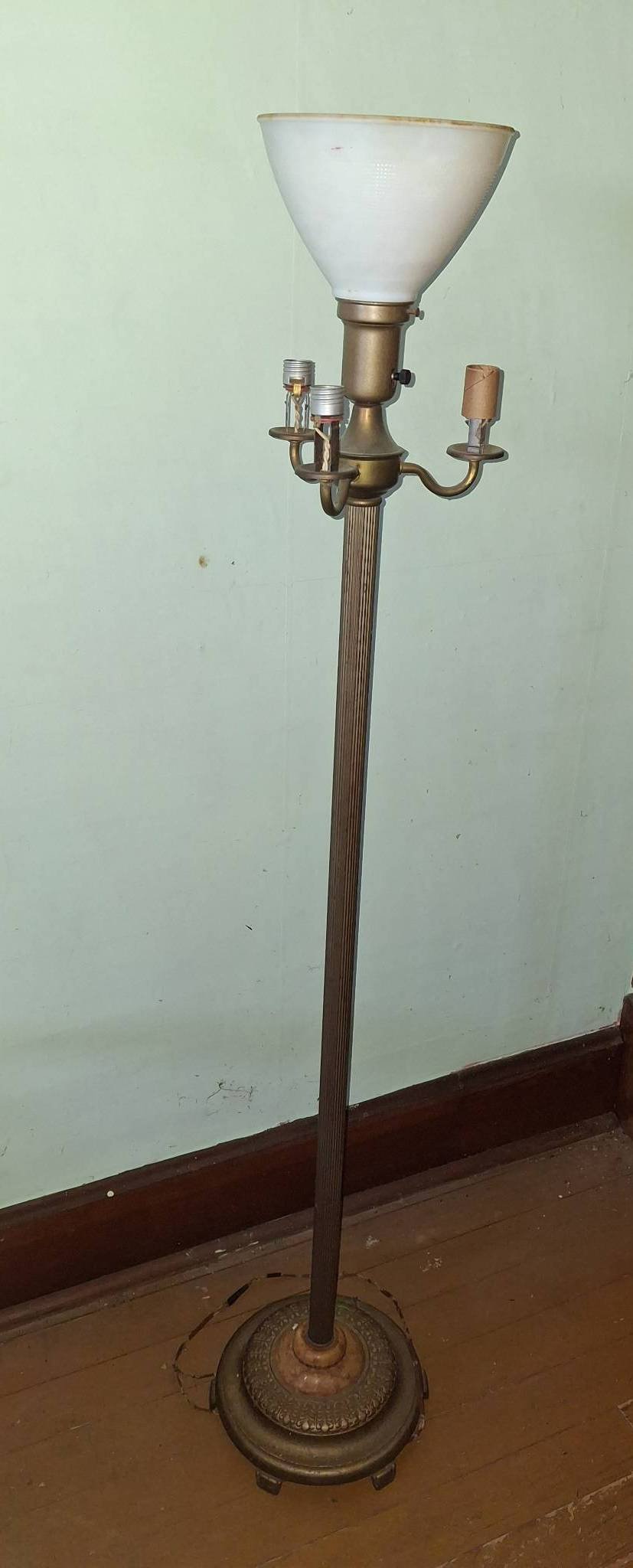 108 Table Lamp with Tapered Shade, Turned Wood and Brass Base 35? Hgt. (Chips in base)