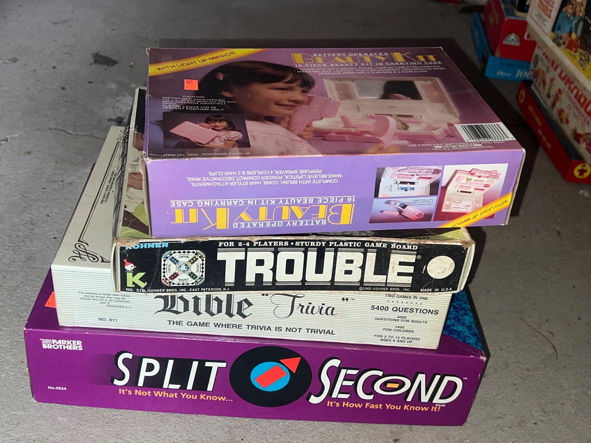 884 Battery-Operated Beauty Kit, Trouble, Bible Trivia, Split Second Games (11” x 8” – 16” x 11”)
