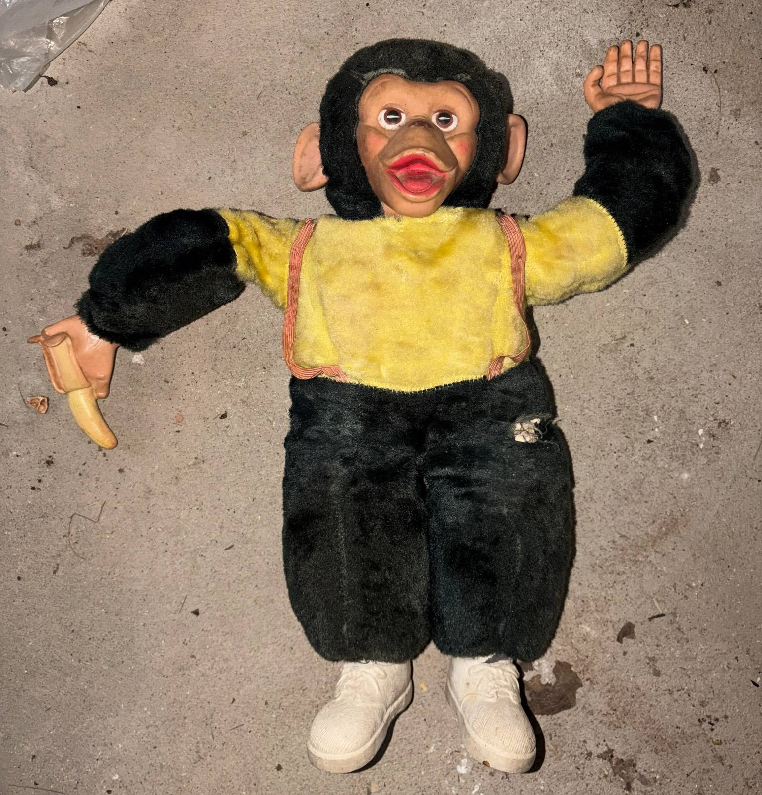 885 Plush Monkey Doll with Yellow Shirt (needs repair), 19?