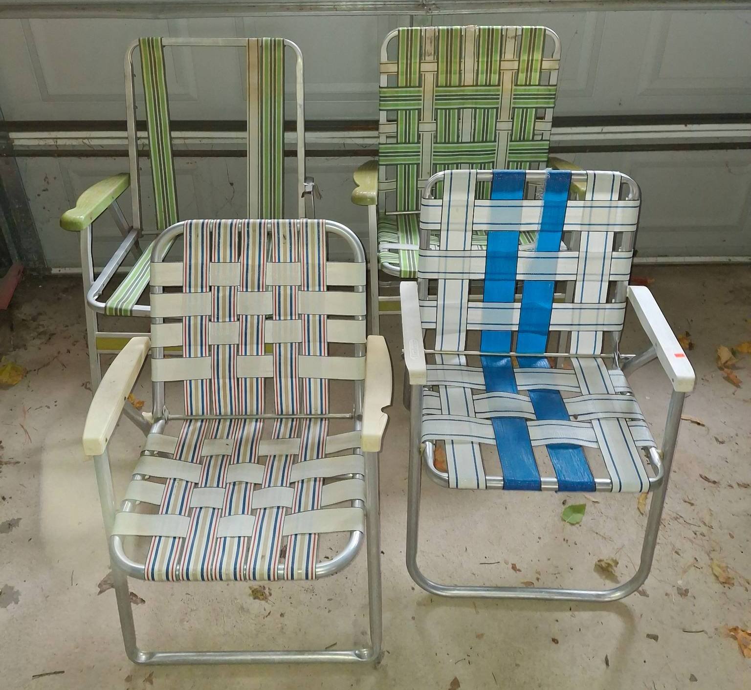 906 4 Aluminum Folding Armchairs with Webbed Straps in Assorted Patterns 22?x14?x30? – 24?x13?x39? (seat & arm rest broken)