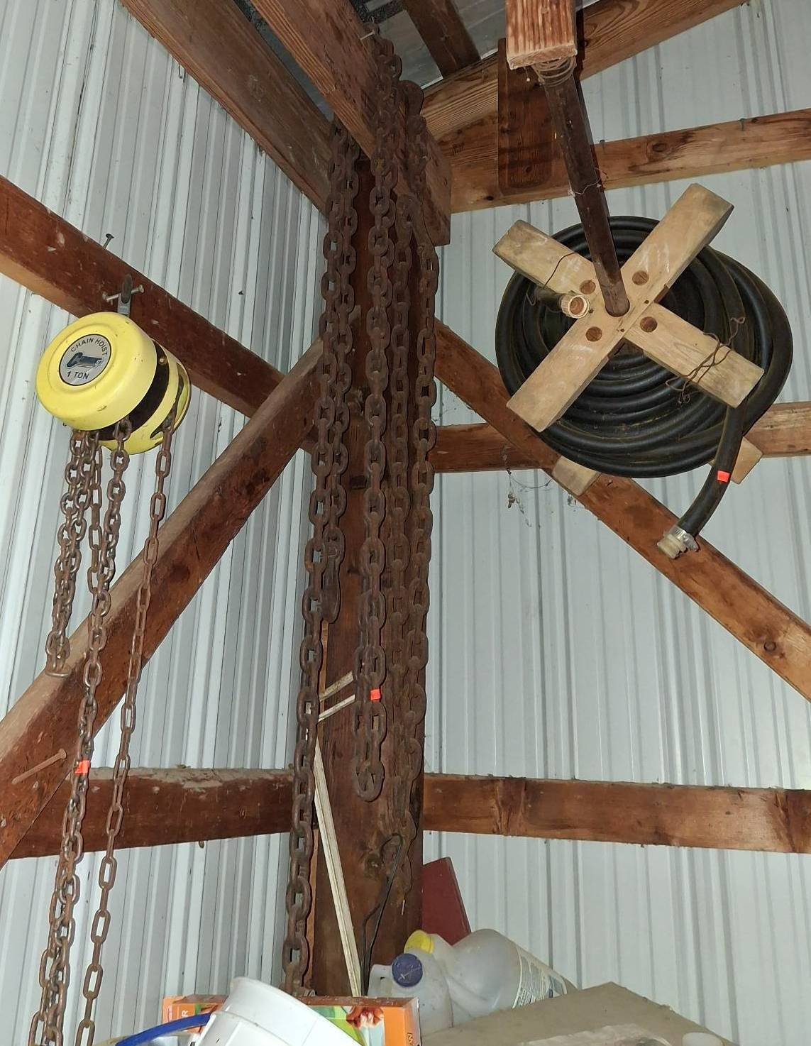 909 1-Ton Chain Hoist with Metal Chains and Wall-Mounted Hose Reel (remove by buyer)