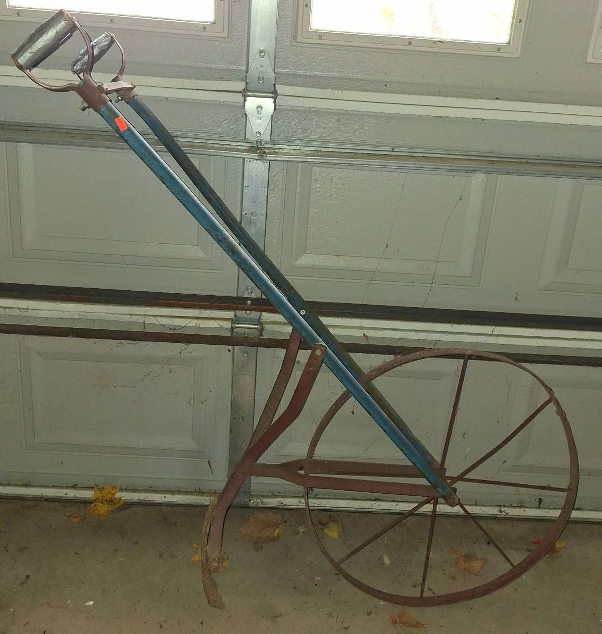 910 Manual Push Cultivator with Steel Wheel and Blue Handle 55?x48? (handles duct taped & rust)