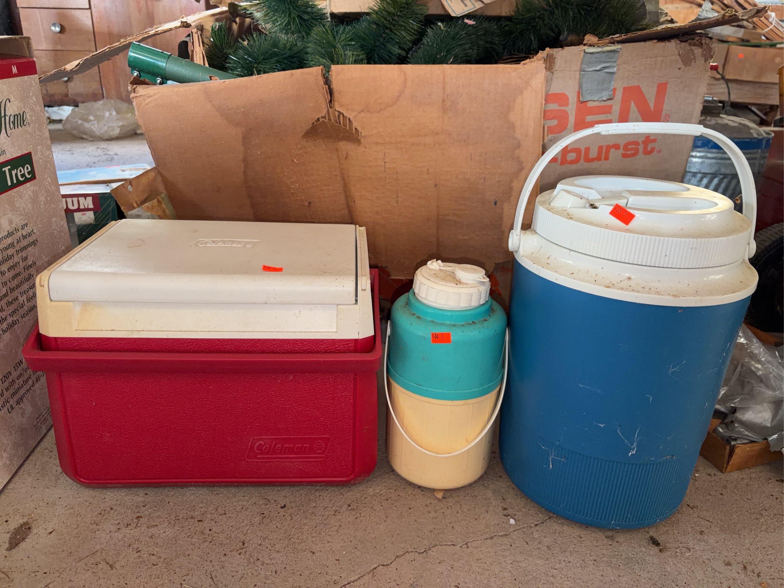 938 Blue thermos model 1526, red Coleman mini cooler & Bee Plastics thermos- cracked, (16”-10”H, cooler 12.5”x8”x10”)