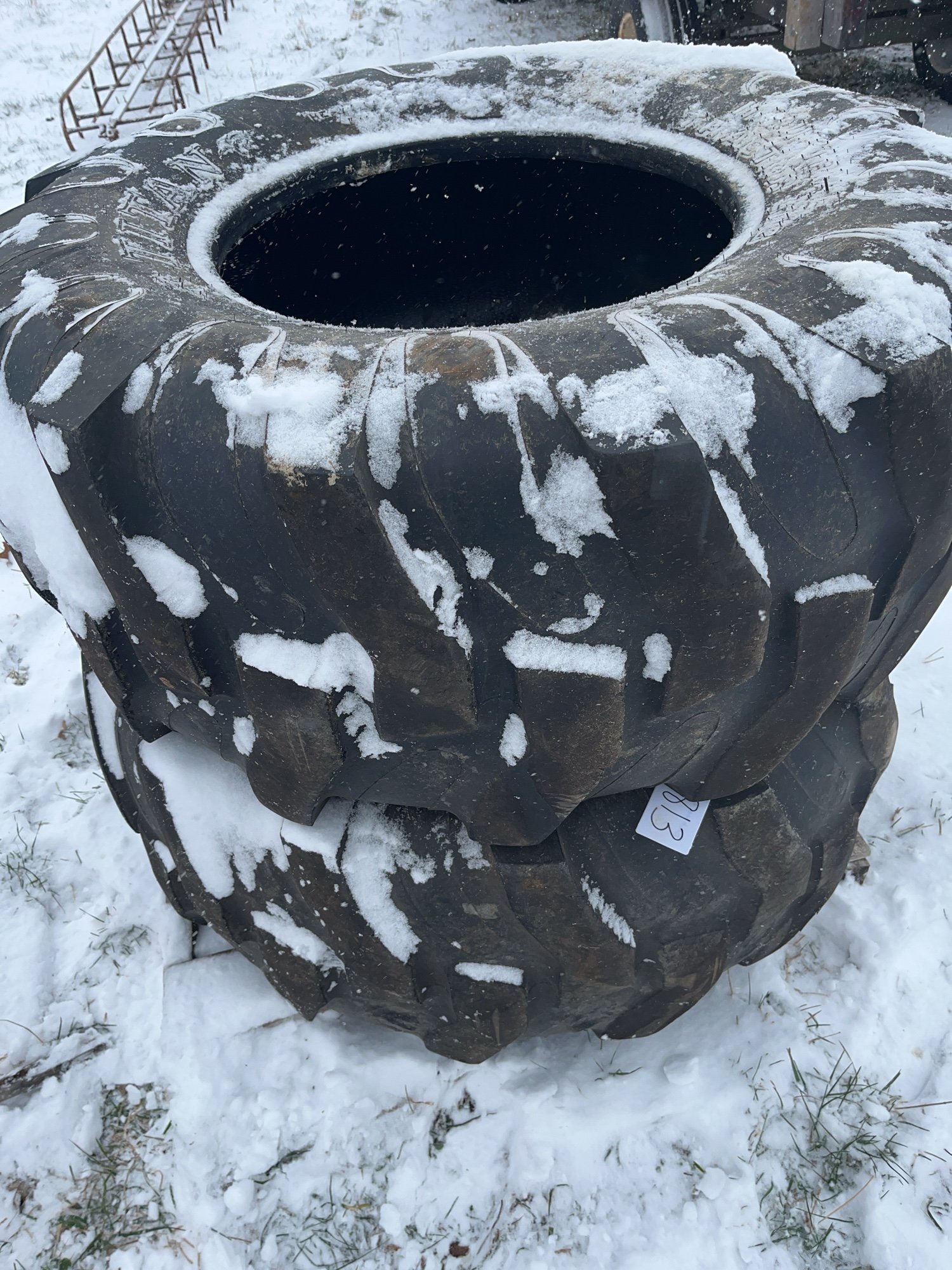 3968 Firestone super all traction 23° radial 18.4x34 tires on double bevel rims, one has broken valve stem