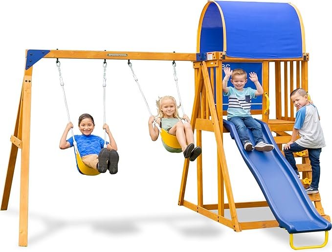 471010 SPORTSPOWER - Wooden Swing Set with Heavy Duty A-Frame & 6ft Double Wall Slide, Bonus Anchor Kit Included