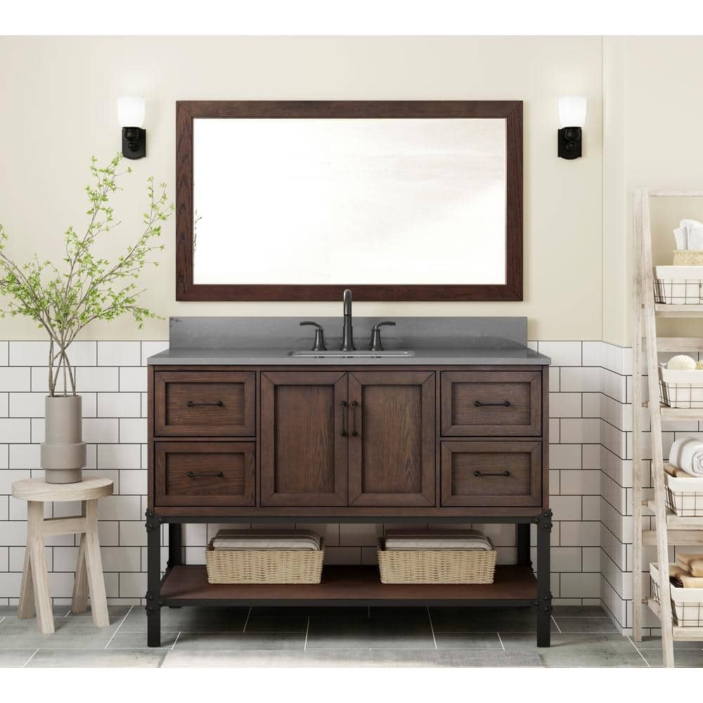 481025 HOME DECORATORS COLLECTION - Alster 46 in. W x 30 in. H Rectangular Wood Framed Wall Bathroom Vanity Mirror in Brown Oak