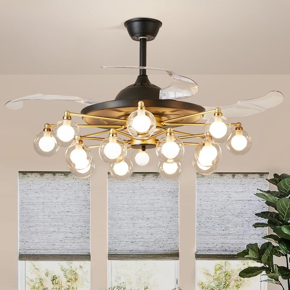 481058 DEPULEY - Chandelier Ceiling Fans with Lights, Black and Gold Retractable Invisible Blades,Sputnik Fandeliers with Double Glass Lampshade - PLEASE SEE PRODUCT DETAILS