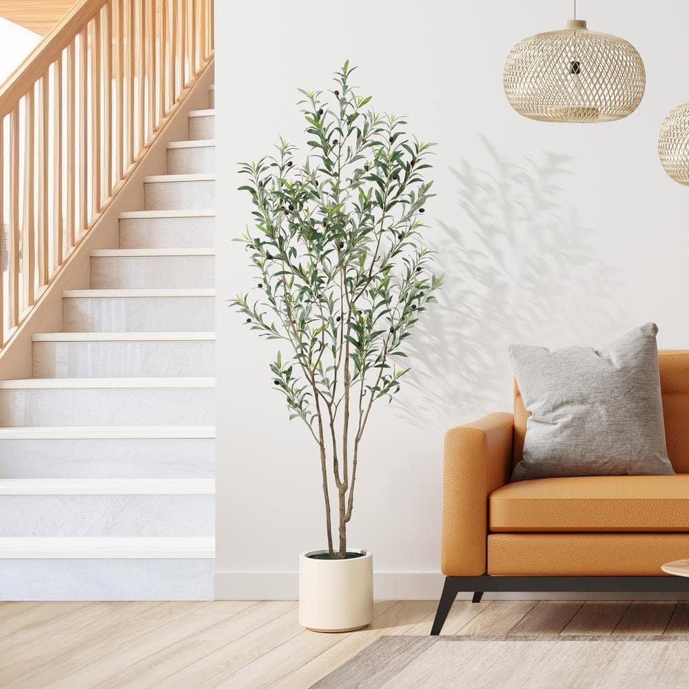 481075 DR.PLANZEN - 7 ft. Artificial Olive Tree with White Planter, Large Faux Olive Silk Tree for Indoor Home Decor and Housewarming Gift