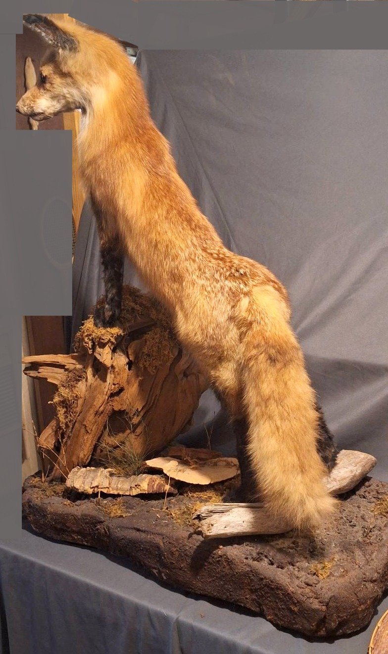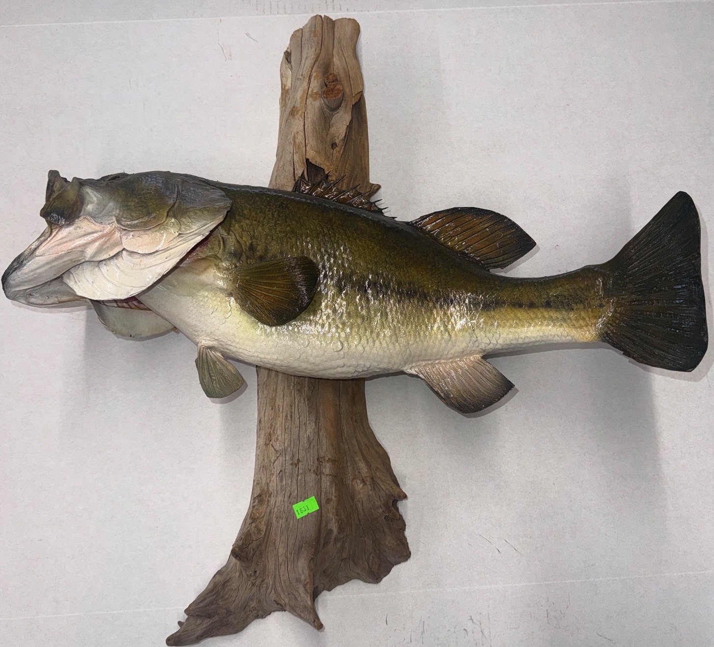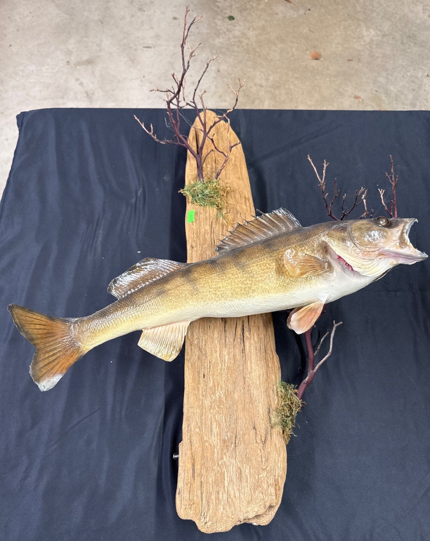 1835 Taxidermy Fish on Wood Mount with Branch and Moss Accents, 27?