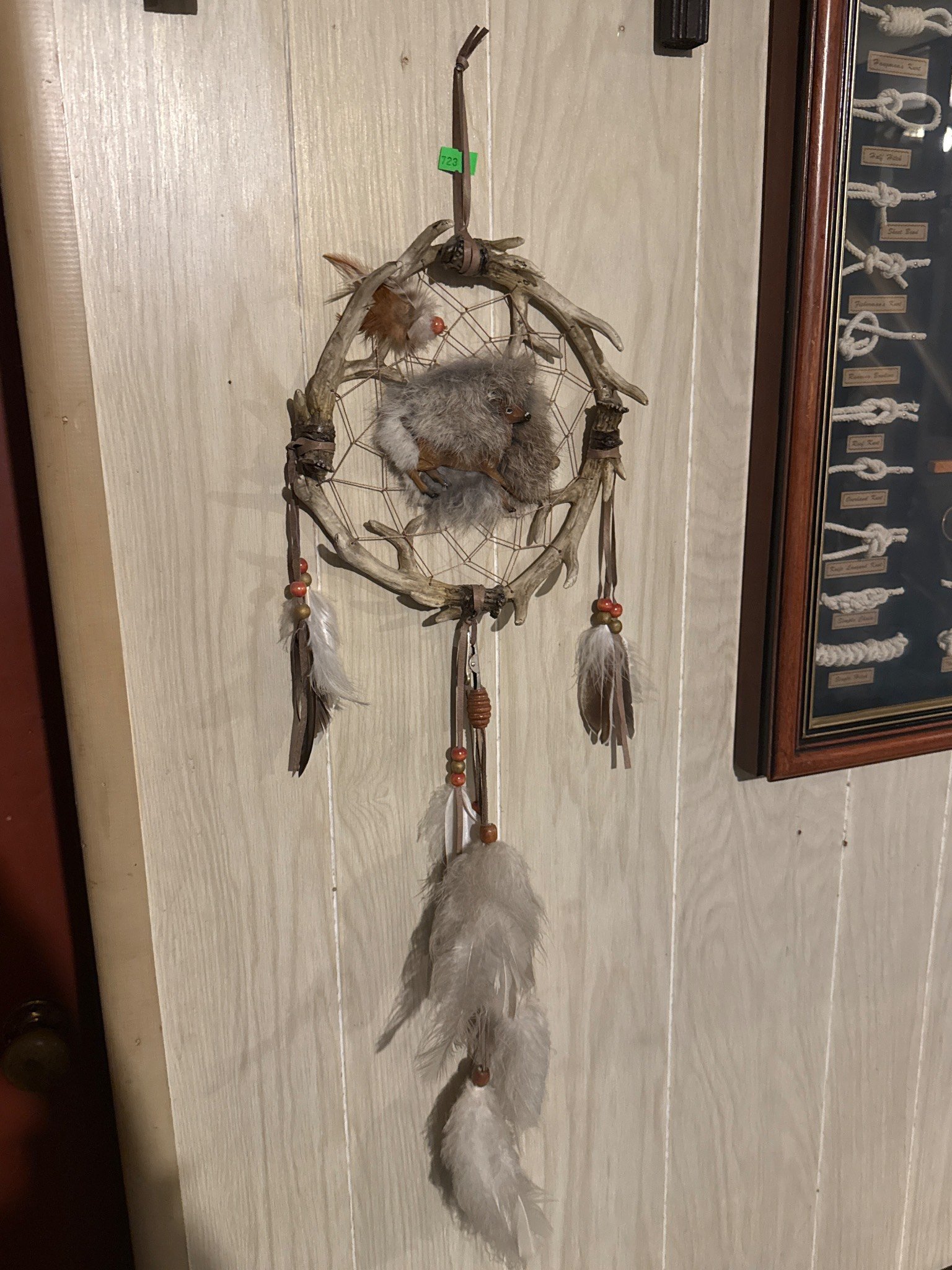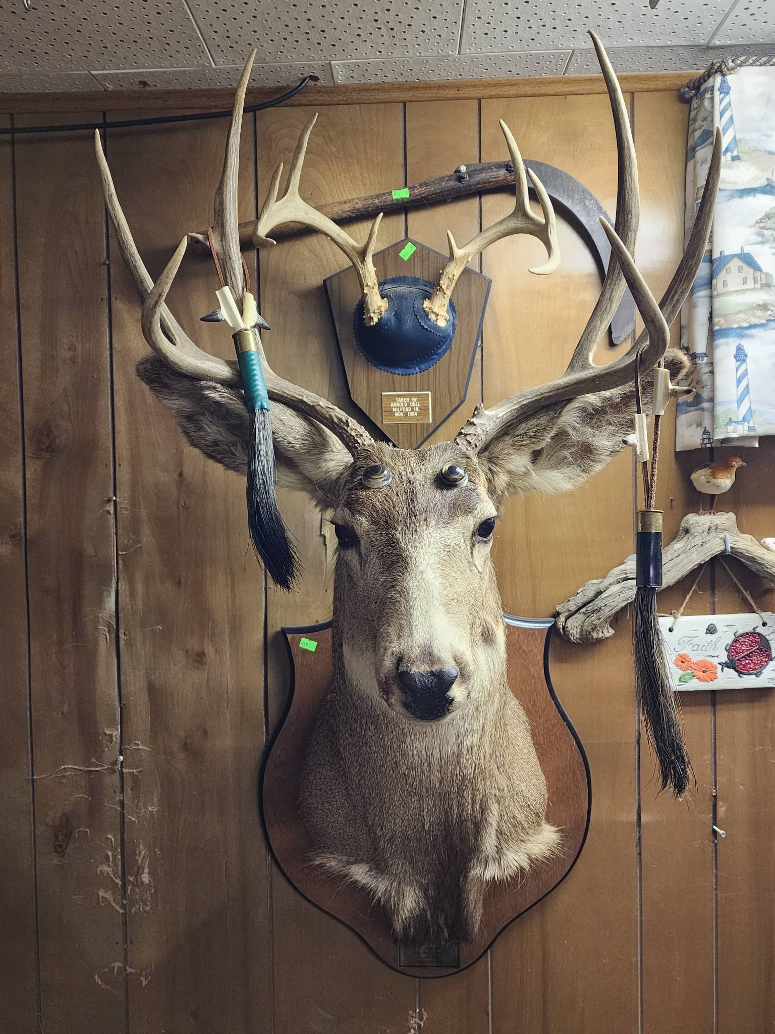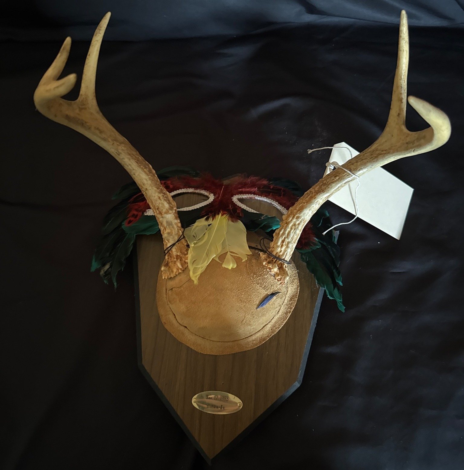 1869 Taxidermy Deer Antlers Mounted on Plaque with Feathered Mask