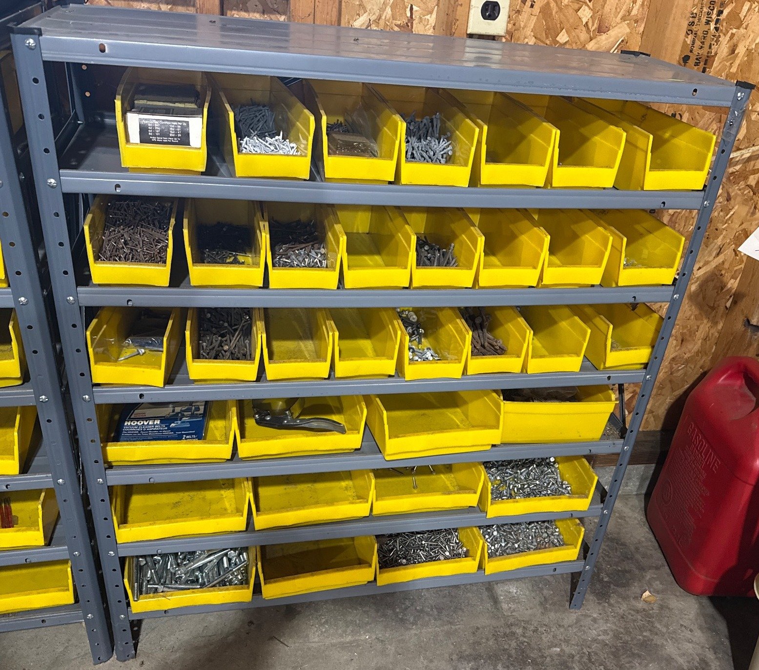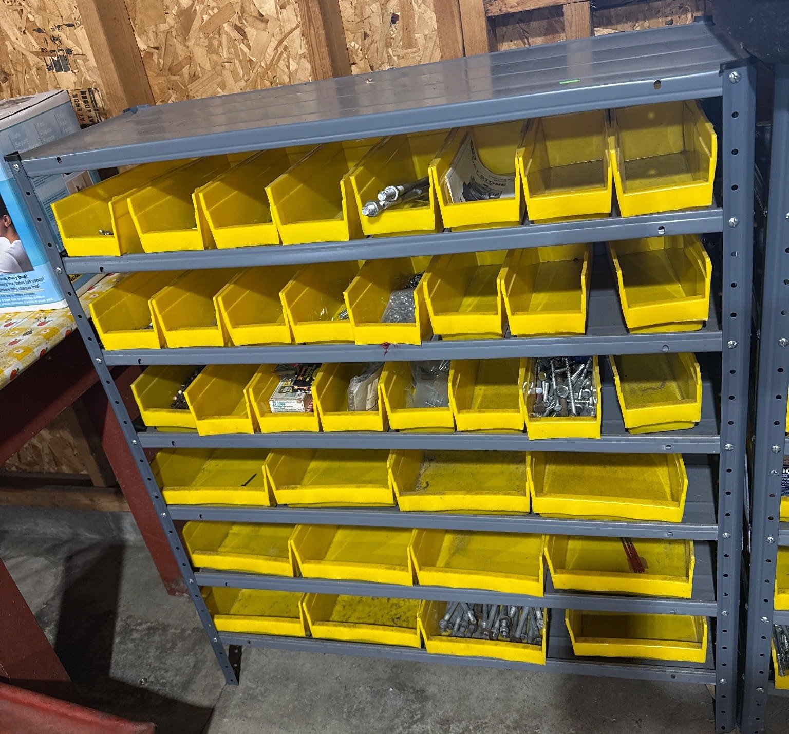 2005 Metal Shelving Unit With Yellow Storage Bins Containing Assorted Fasteners and Hardware, 41.5×36.5×12?