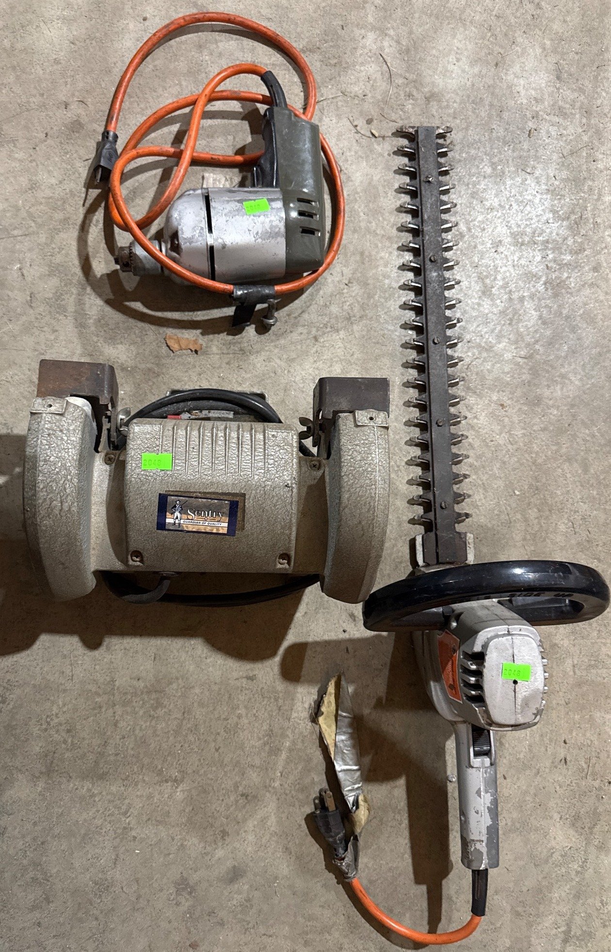 2048 Sentry Bench Grinder, Black & Decker Hedge Trimmer, and Electric Hand Drill