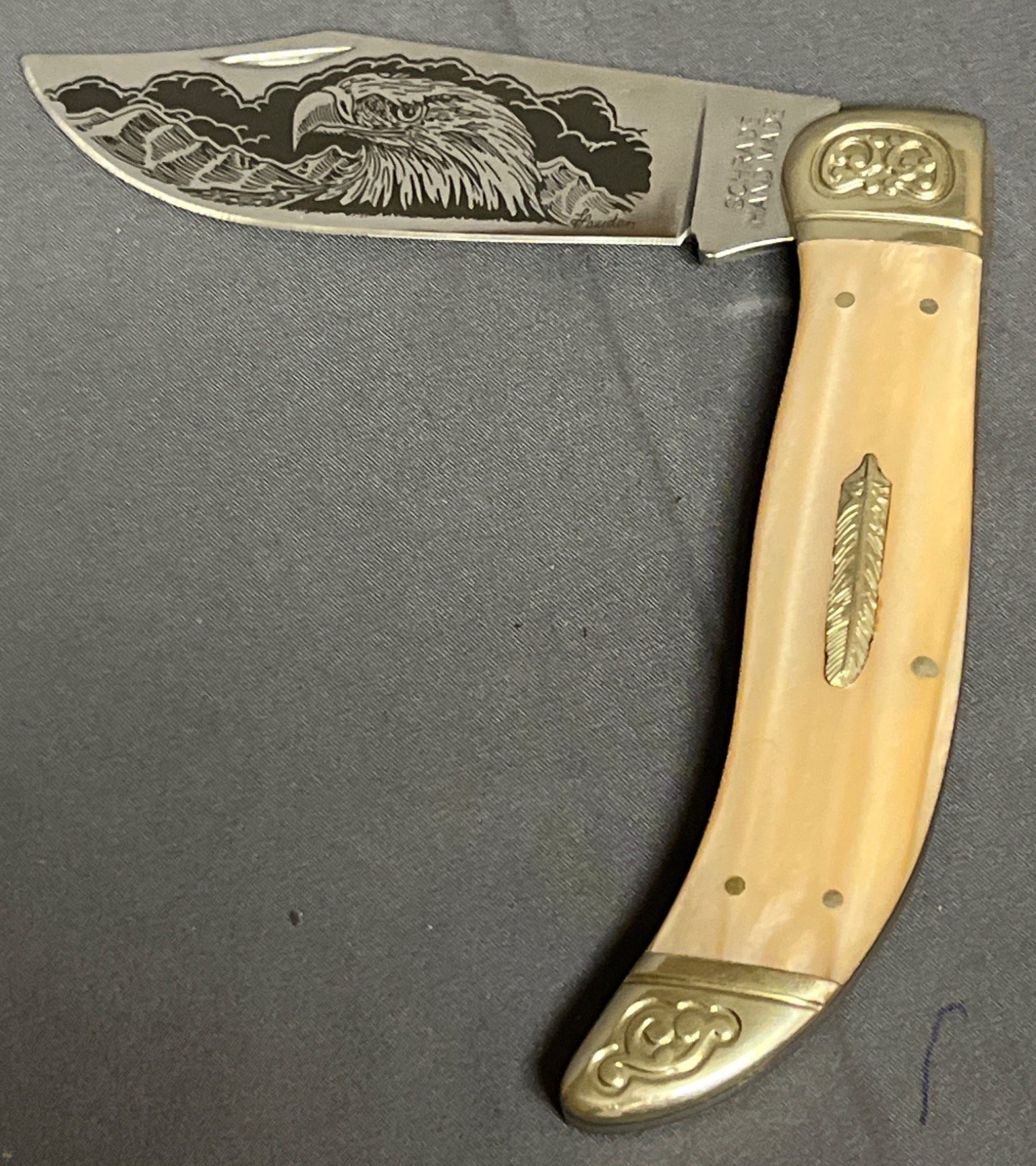 42 Schrade Hand Made Folding Knife with Engraved Eagle Blade and Box