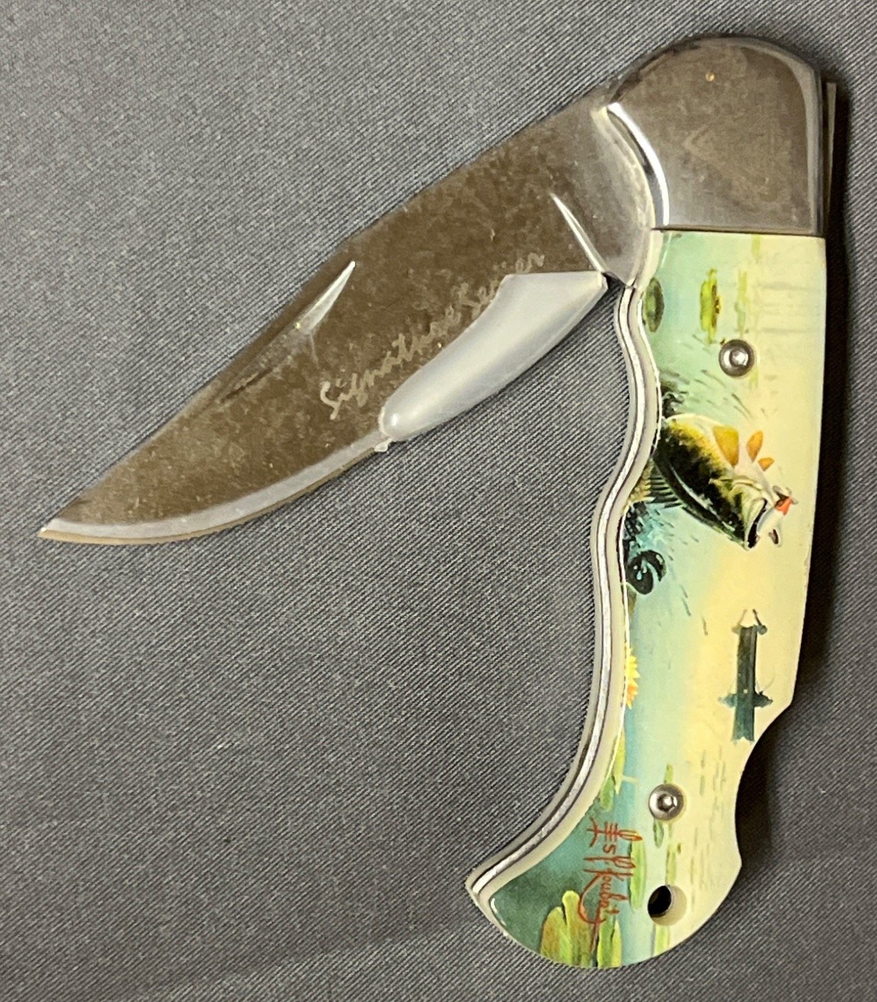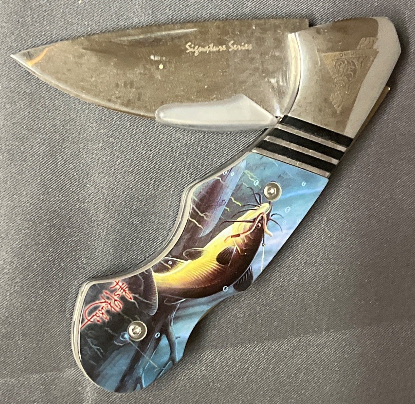 47 North American Fishing Club Folding Knife with Catfish Design and Tin Case