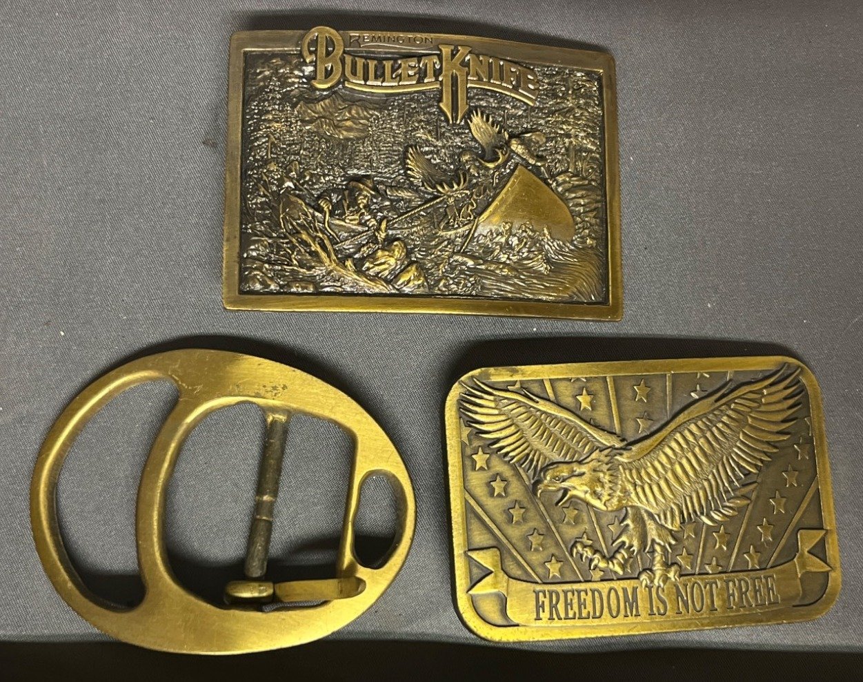 60 3 Brass Belt Buckles Featuring ‘Freedom Is Not Free,’ 2014 Sponsor, and Remington Bullet Knife Designs