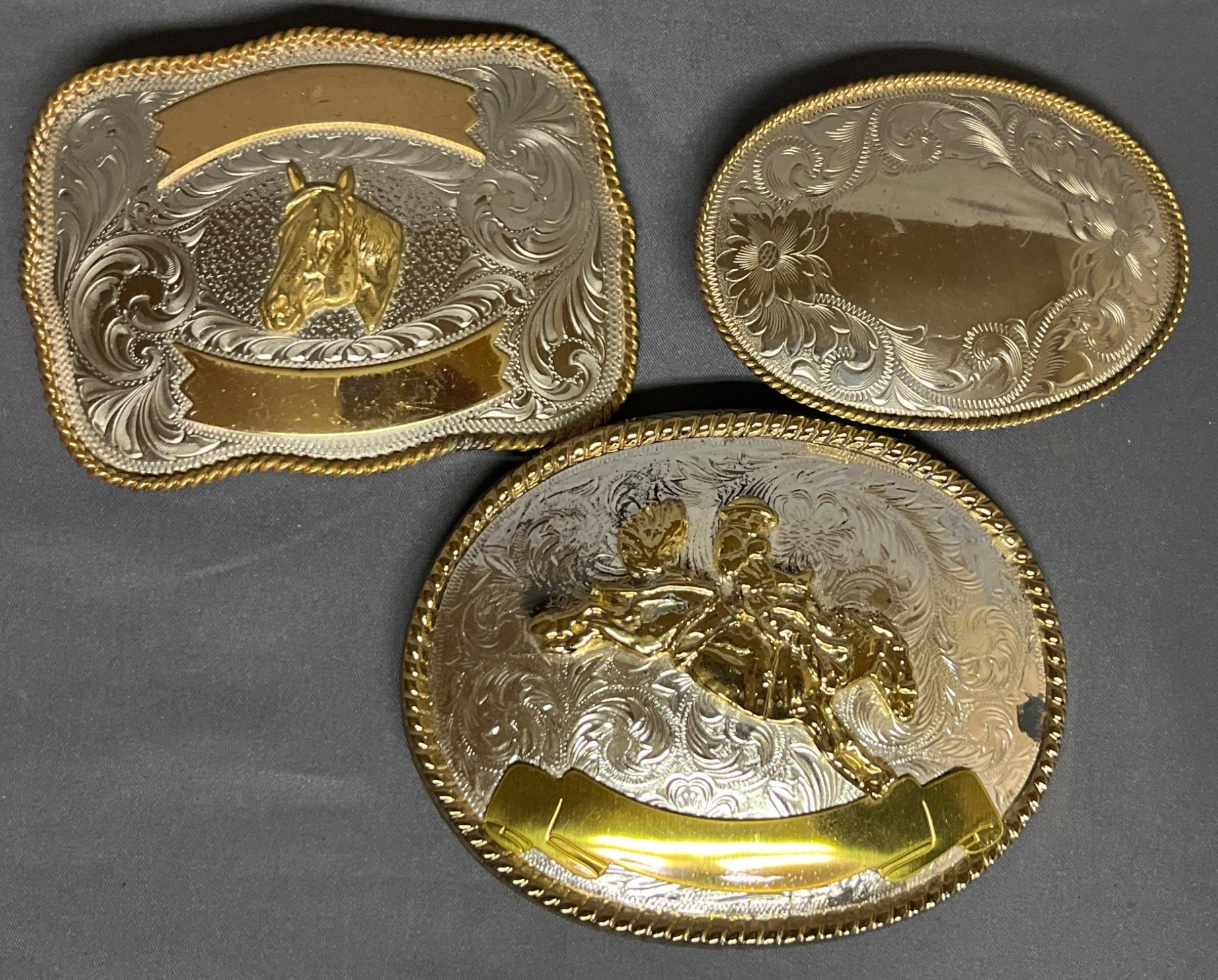 62 3 Montana Silversmiths Nickel Belt Buckles With Equestrian Motifs, Made in U.S.A.