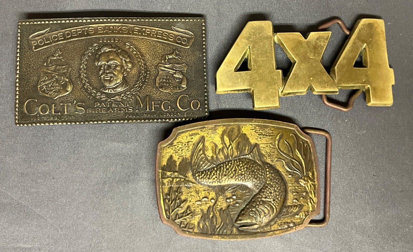 64 3 Brass Belt Buckles Featuring Colt Firearms, Fish Design, and 4×4 Motif