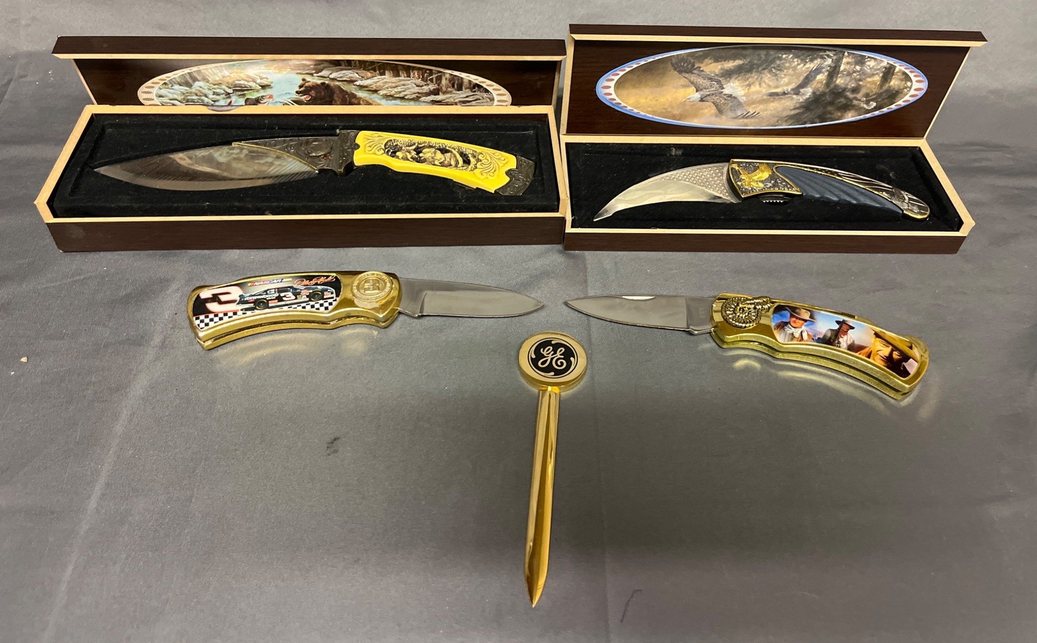 73 4 Stainless Steel Folding Knives with Themed Handles and 1 Pen
