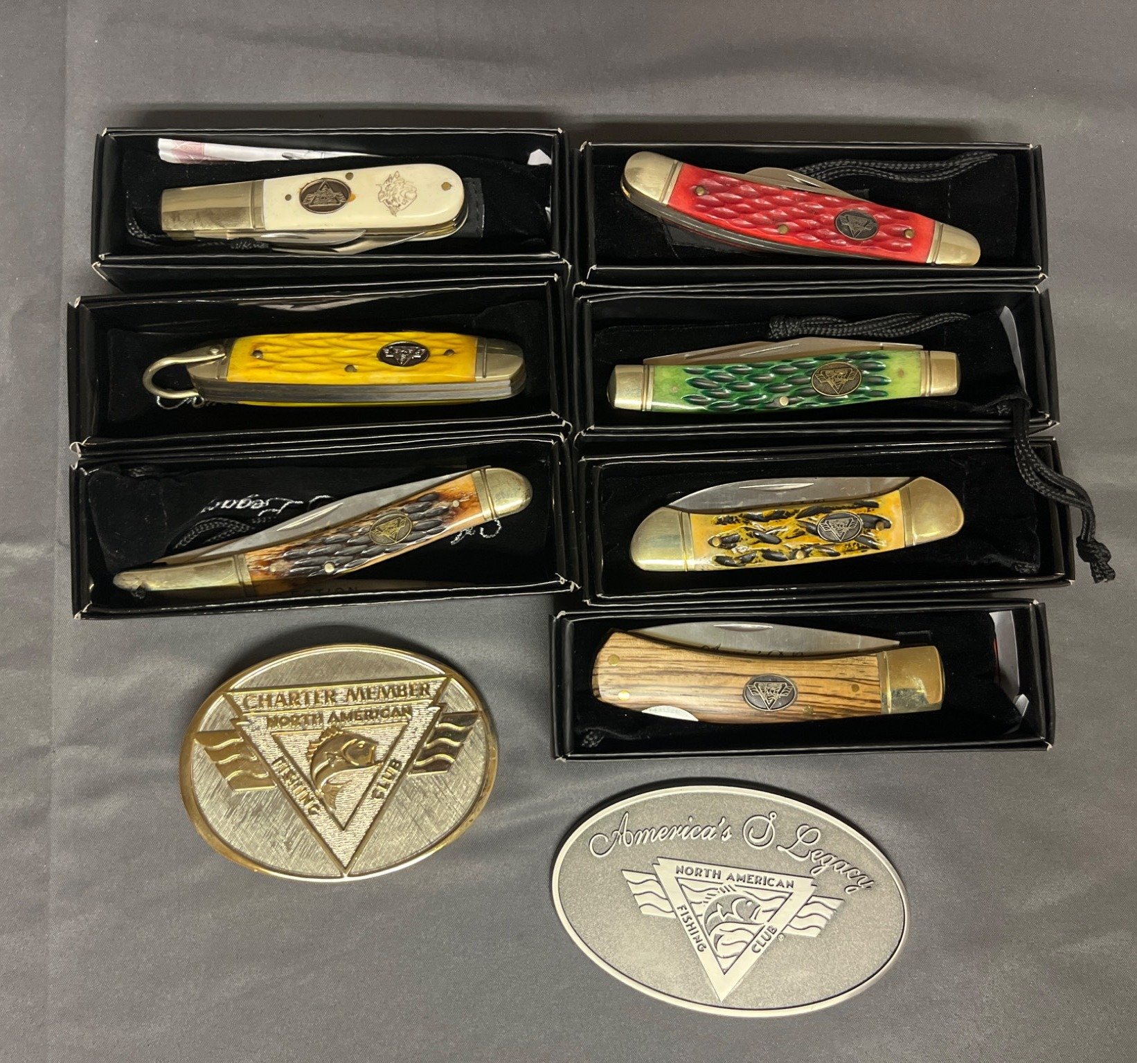 83 North American Fishing Club Collector’s Edition Pocket Knives and Belt Buckle