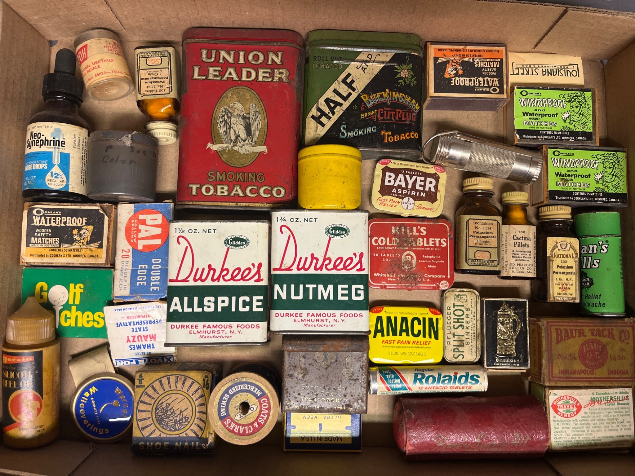 84 Tins, Bottles, and Containers Featuring Union Leader Smoking Tobacco, Durkee’s Spices, Bayer Aspirin and Anacin