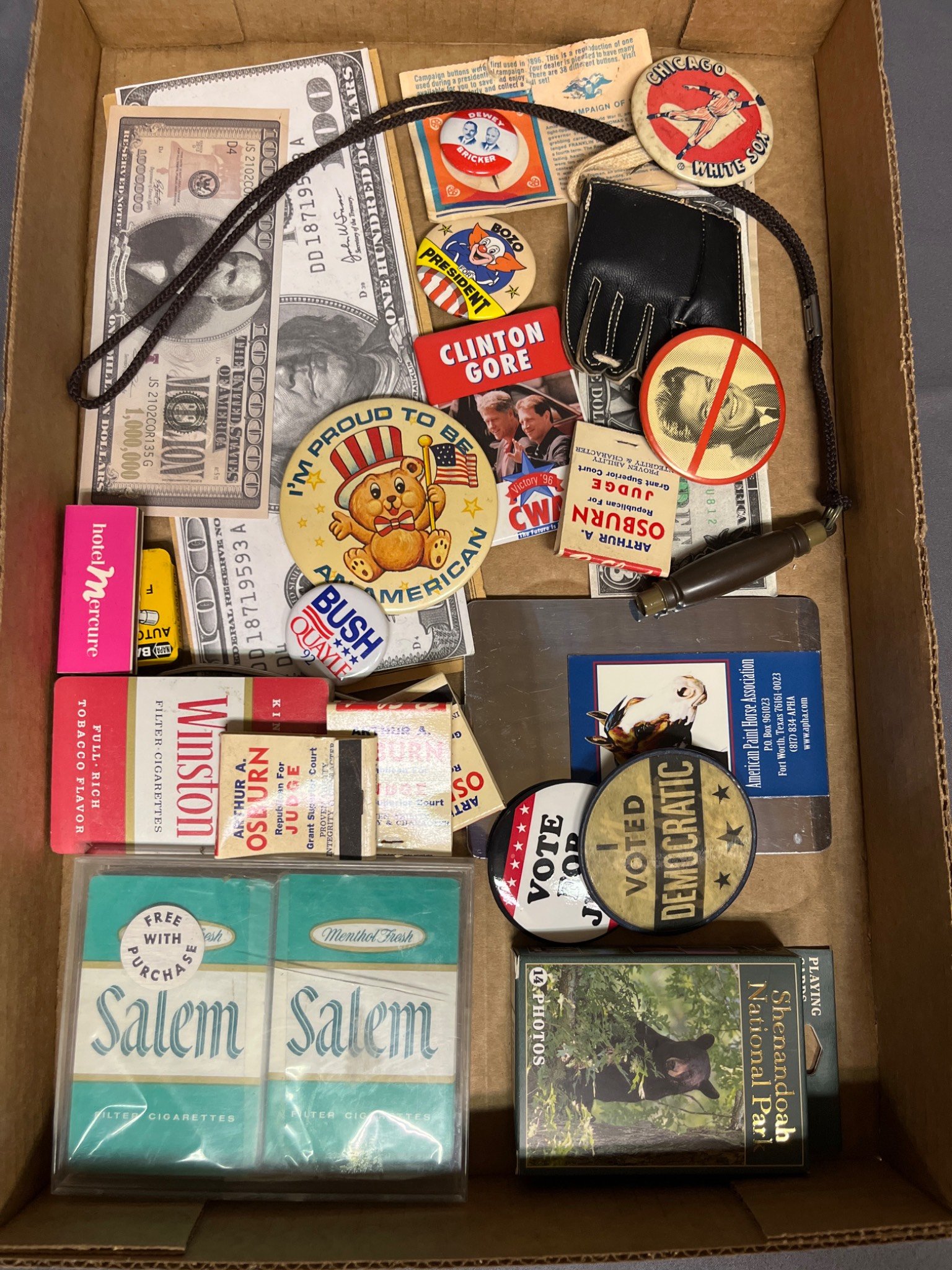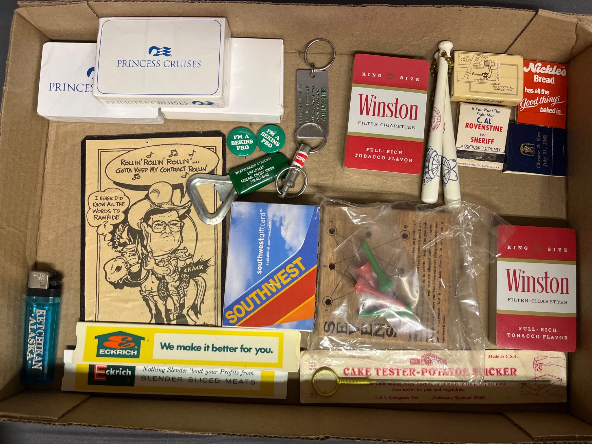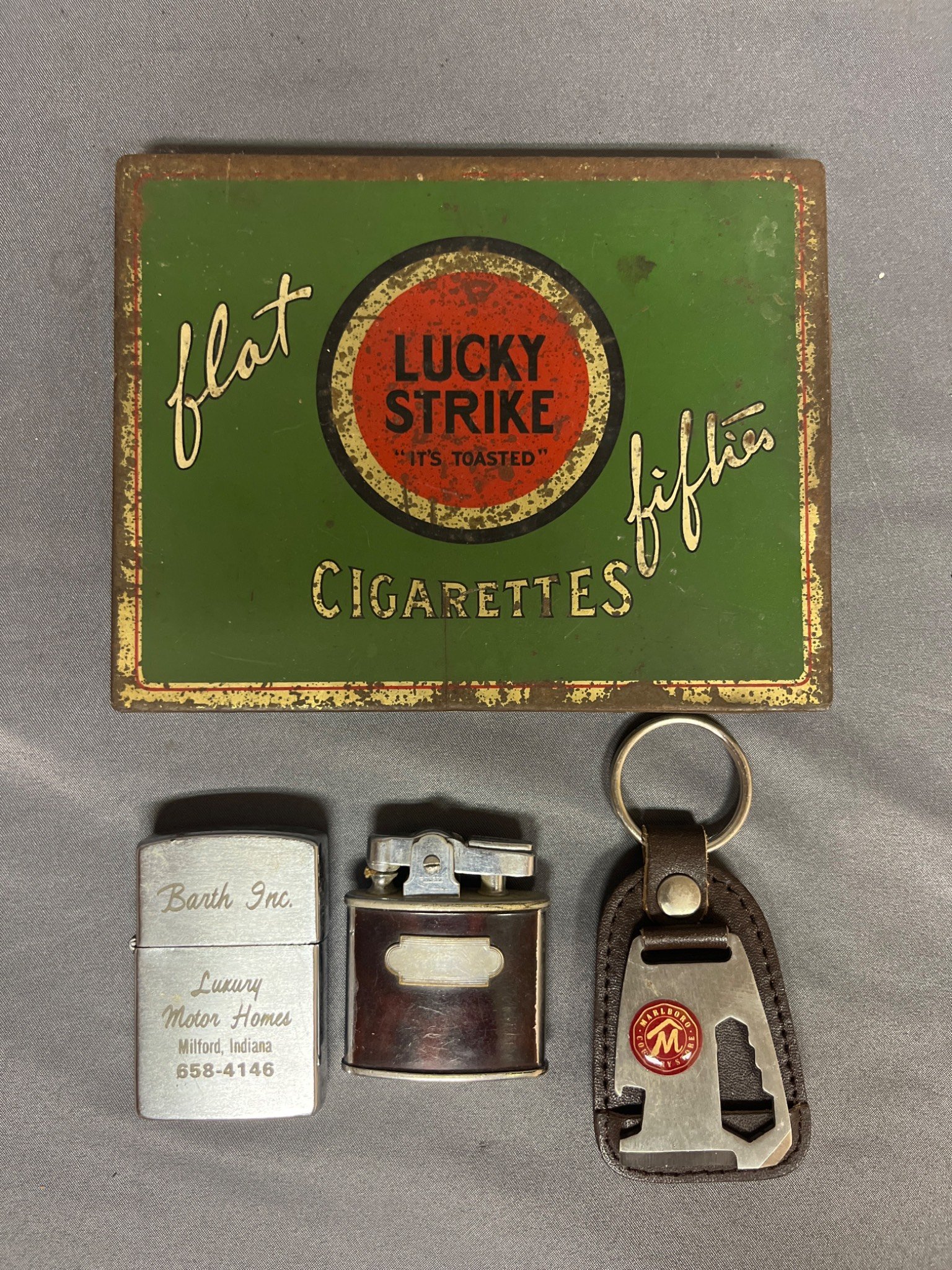 87 Lucky Strike Tin Box, Barth Inc. Lighter Pair, and Leather Keychain with Bottle Opener