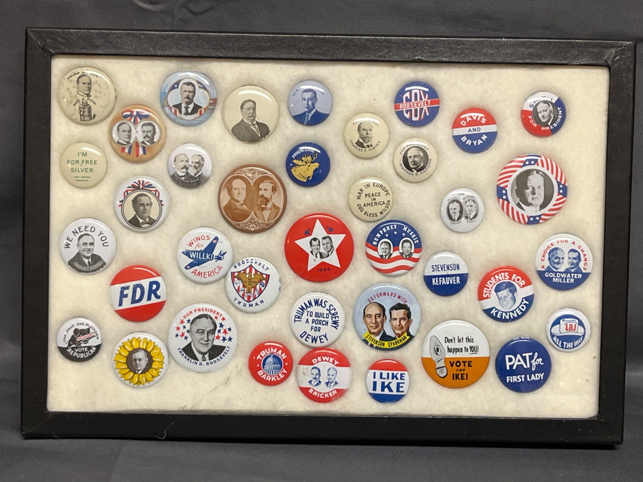 89 Framed Collection of Historical U.S. Political Campaign Buttons Inc. Roosevelt, Truman and Eisenhower