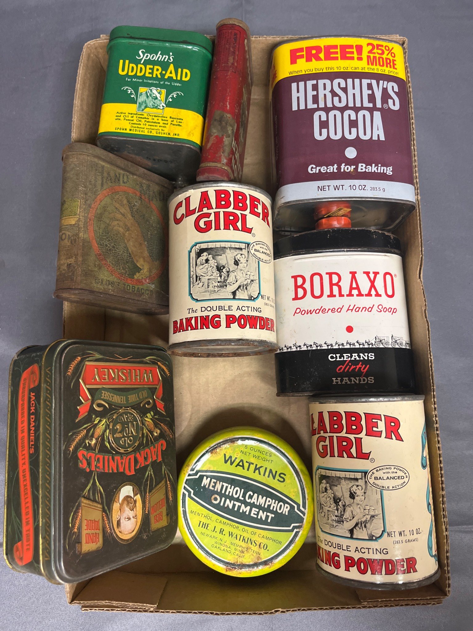 90 Branded Metal Tins and Containers Inc. Baking Powder, Cocoa, and Ointment From Clabber Girl, Hershey’s Cocoa and Union Leader Tobacco