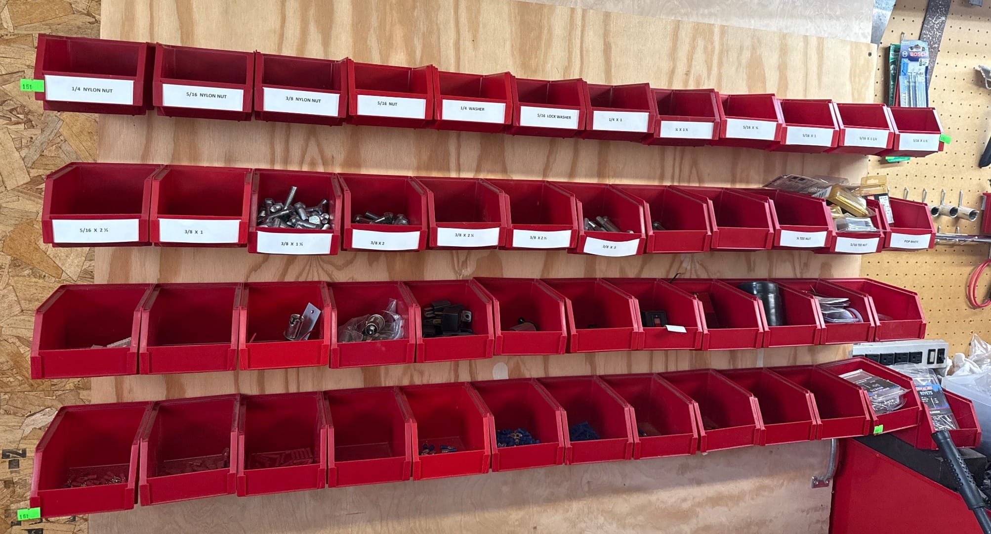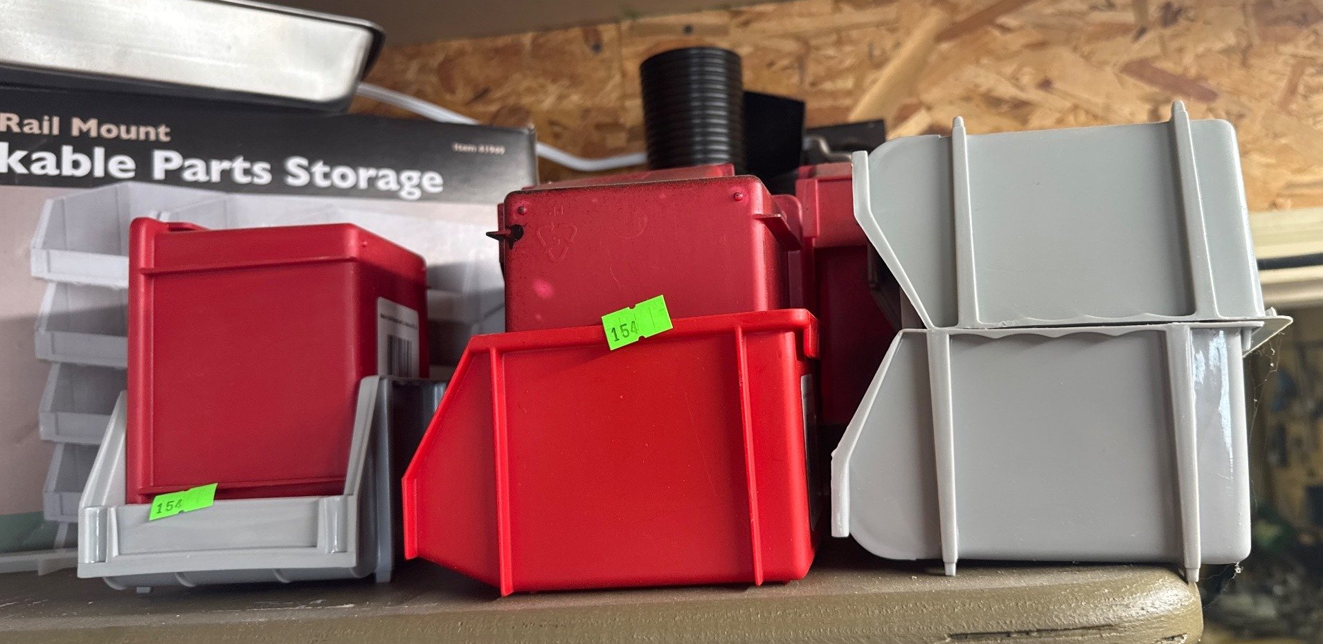 151 Red Plastic Parts Storage Bins with Wall Mounting Setup with Hardware