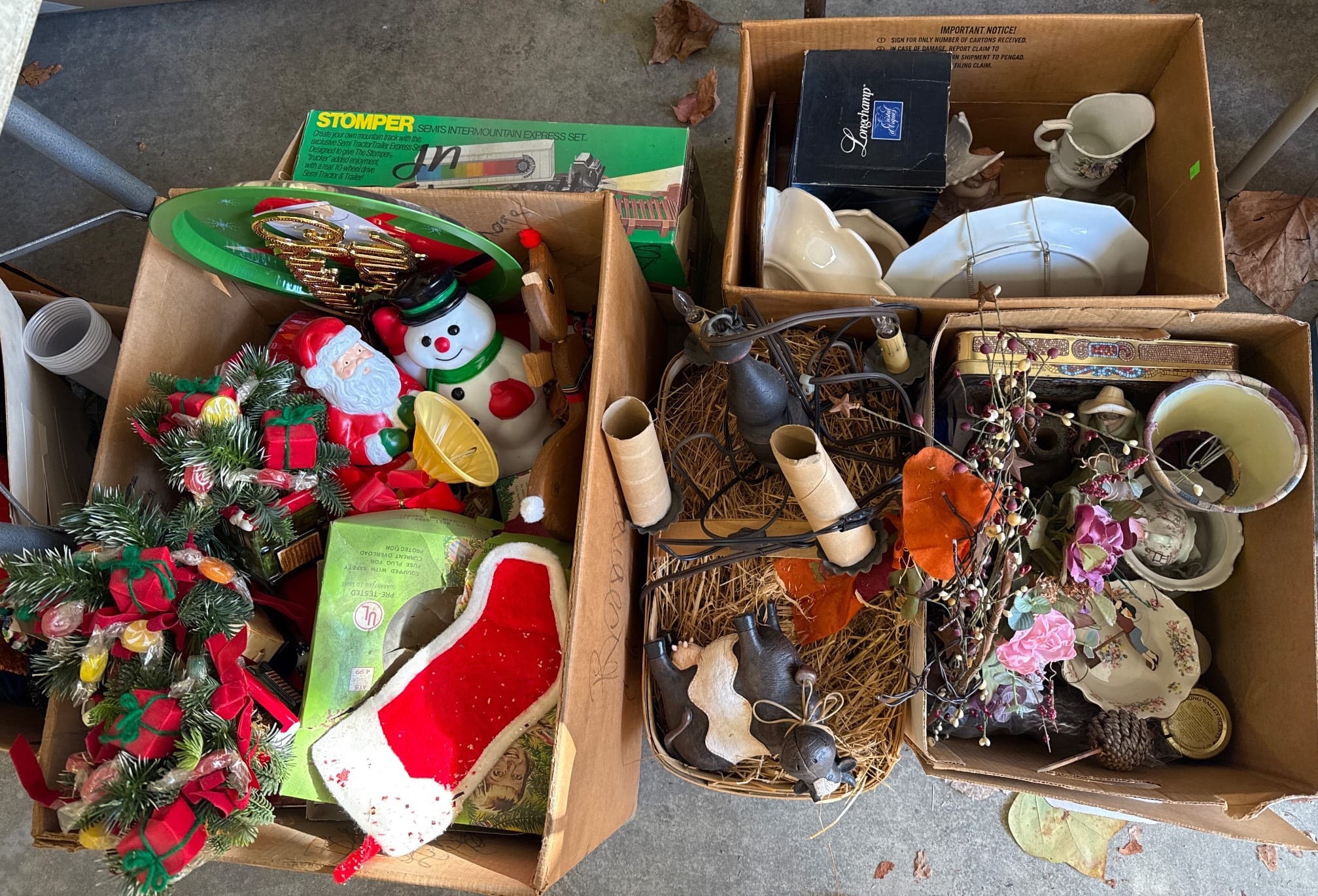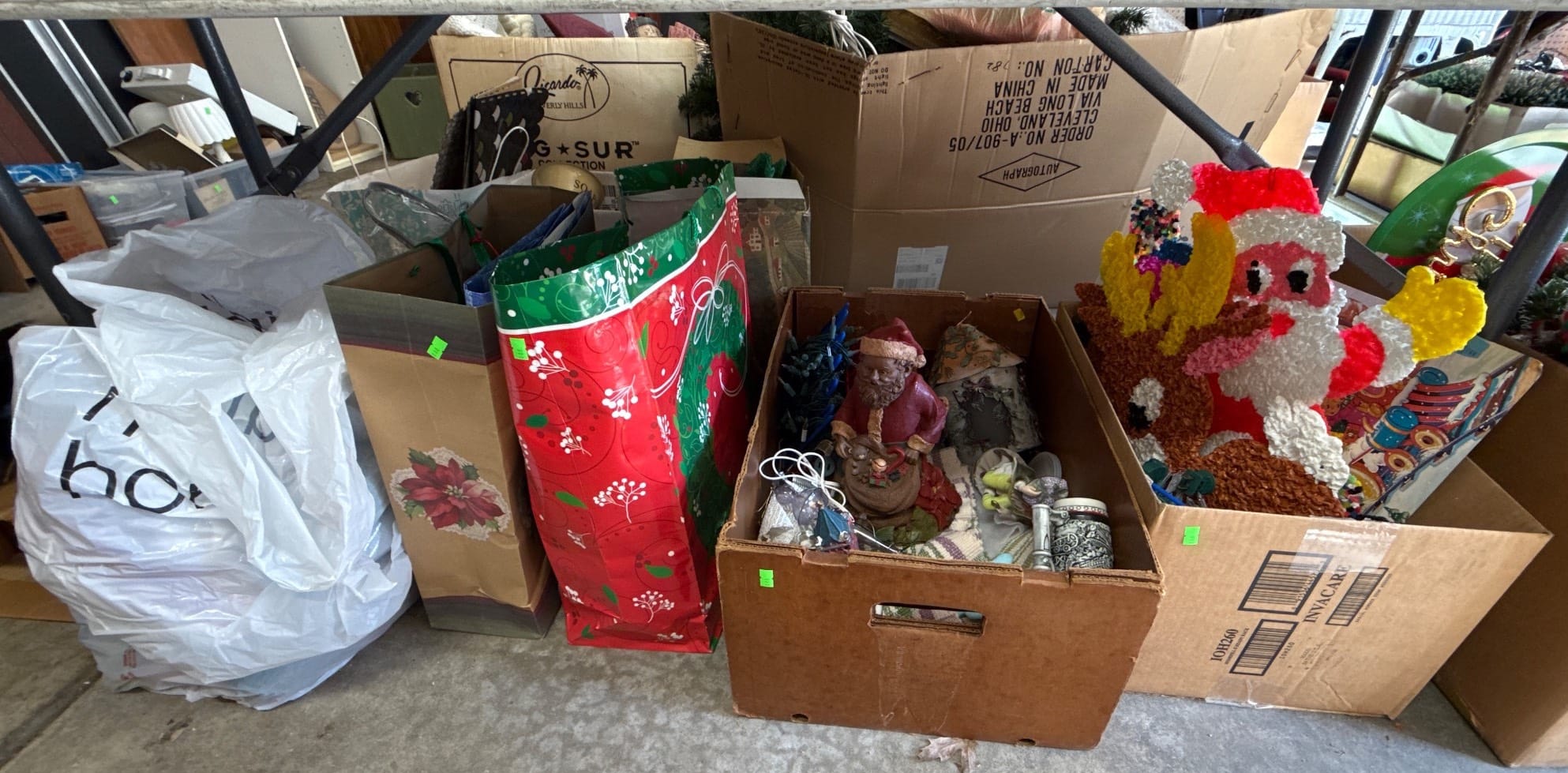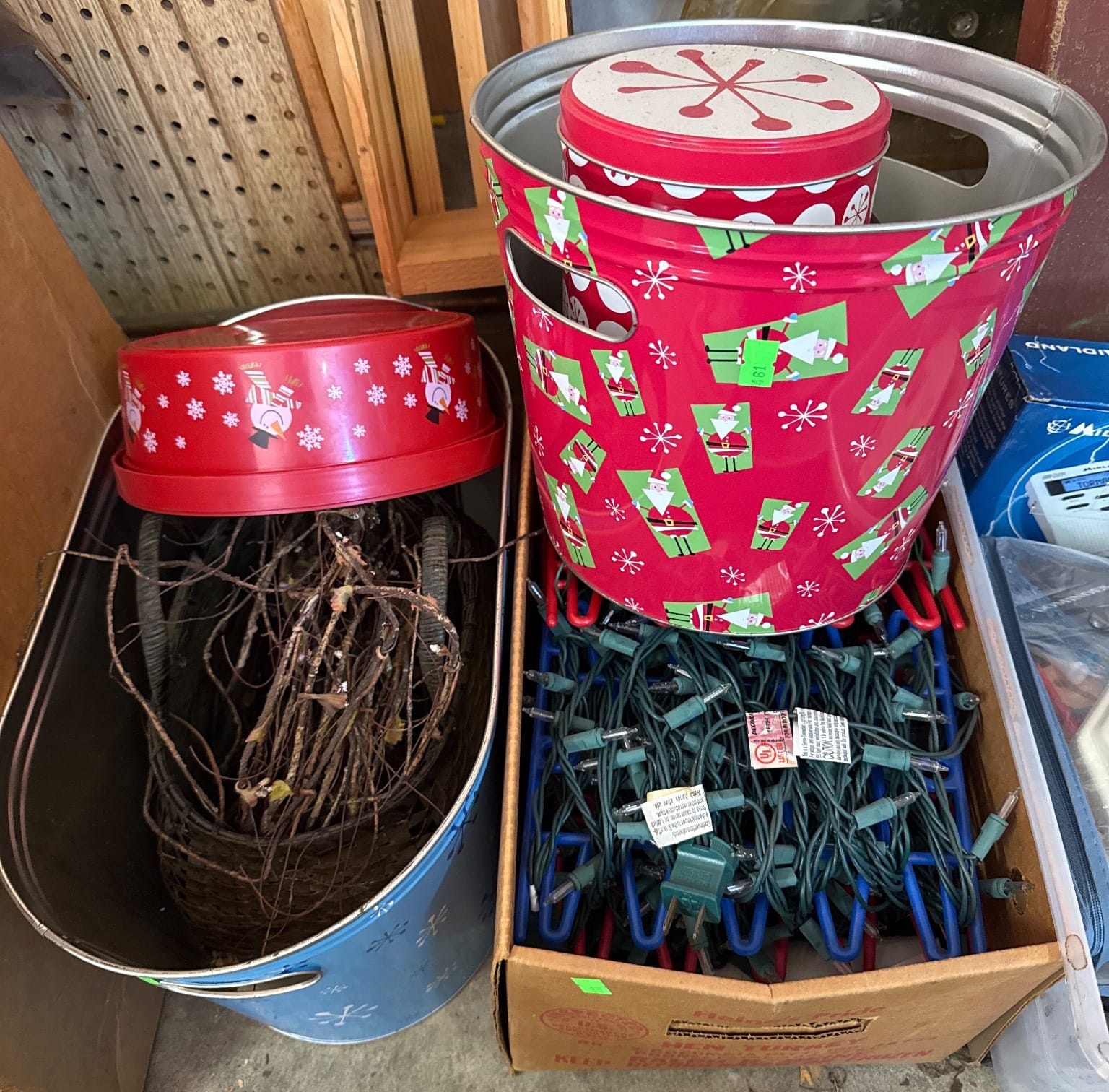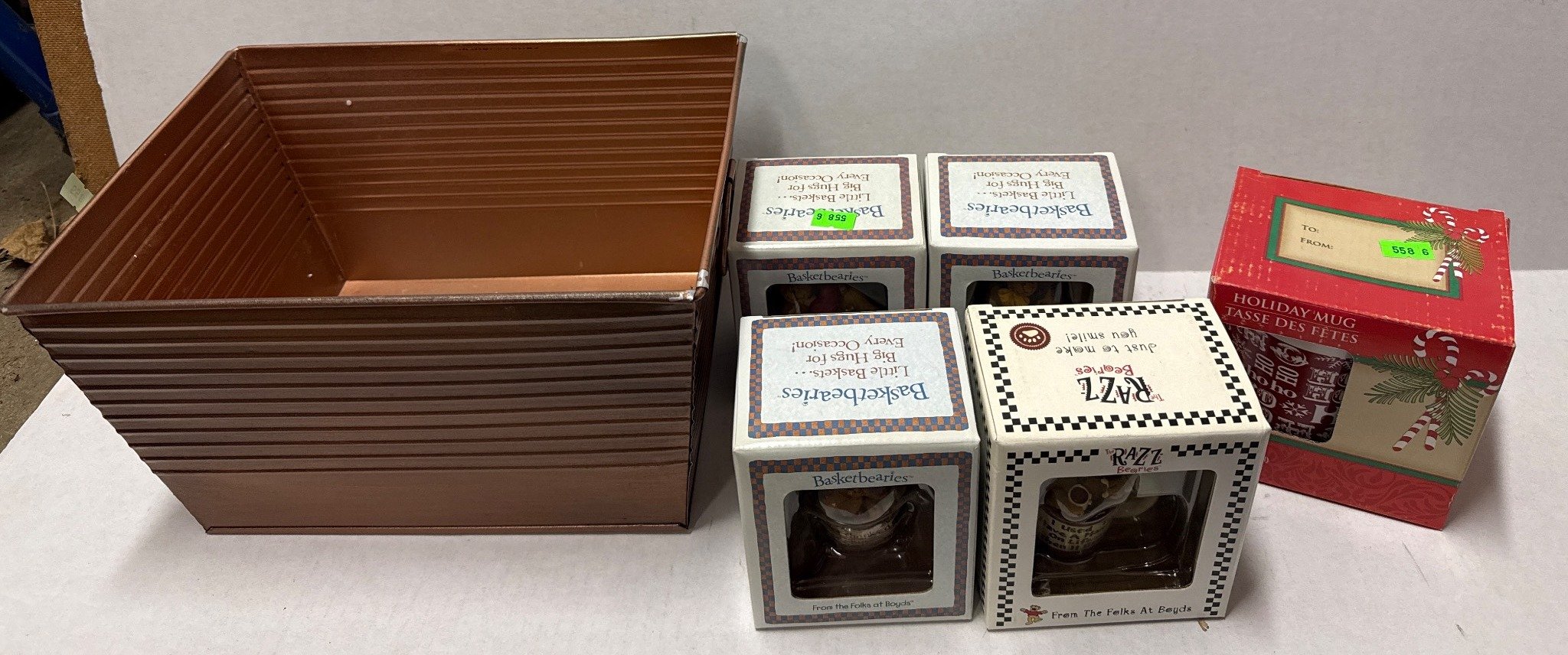 558 Metallic Bin with Holiday Figurines and Mugs