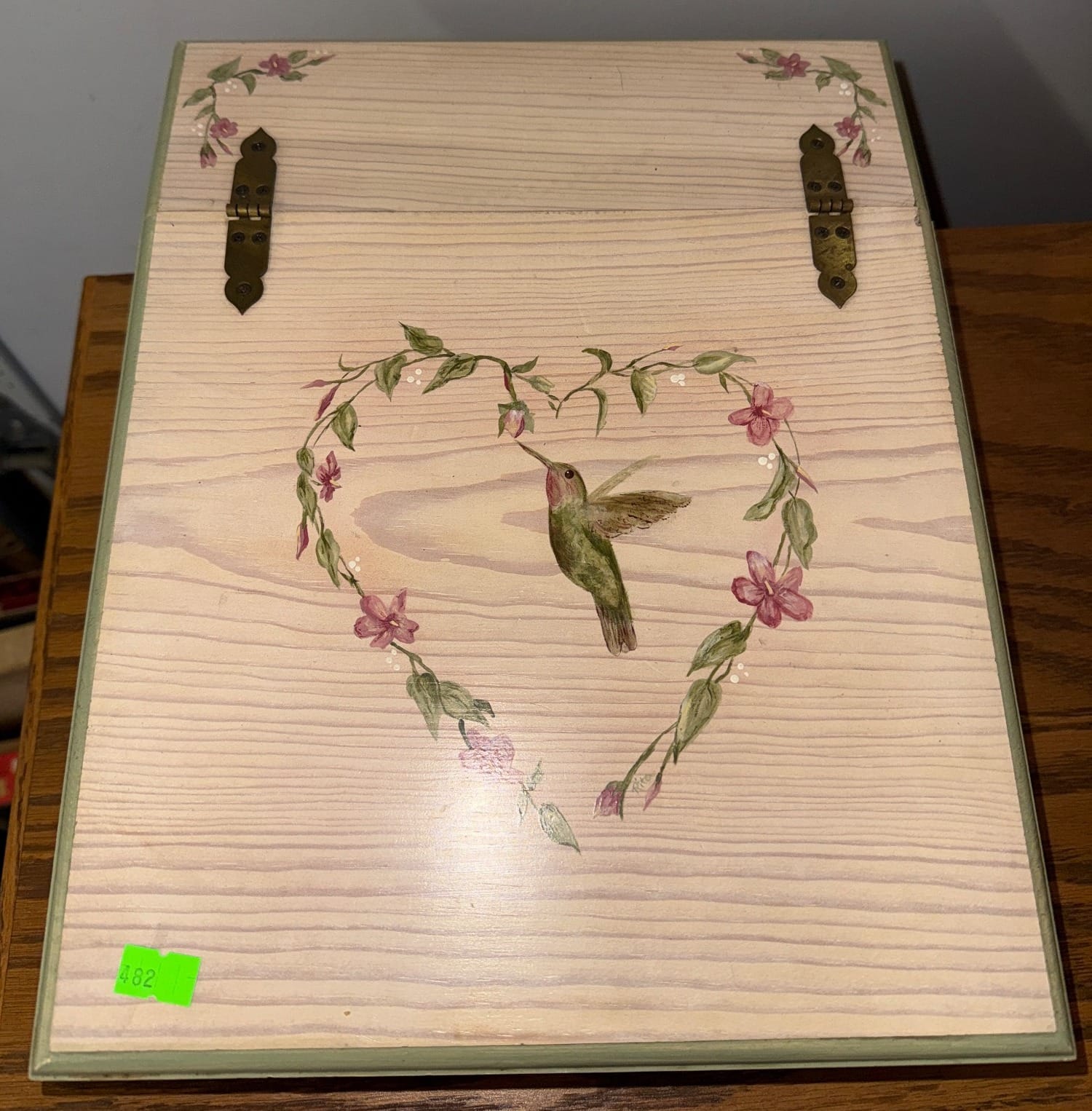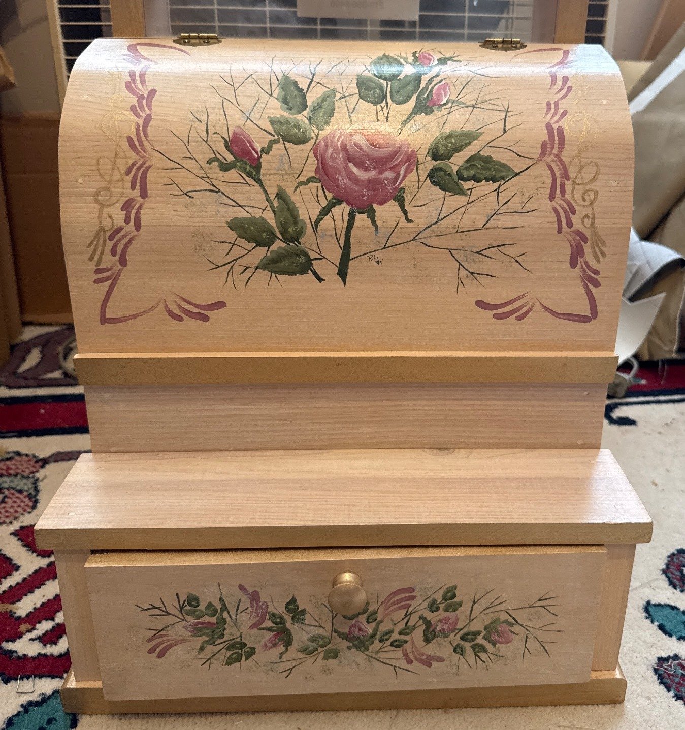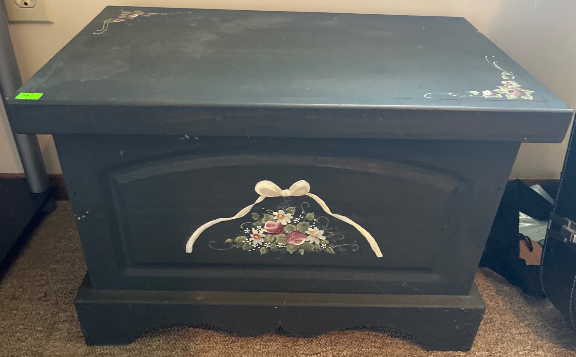 607 Painted Storage Chest with Floral Accents and Glass Ashtrays, 12x12x14?