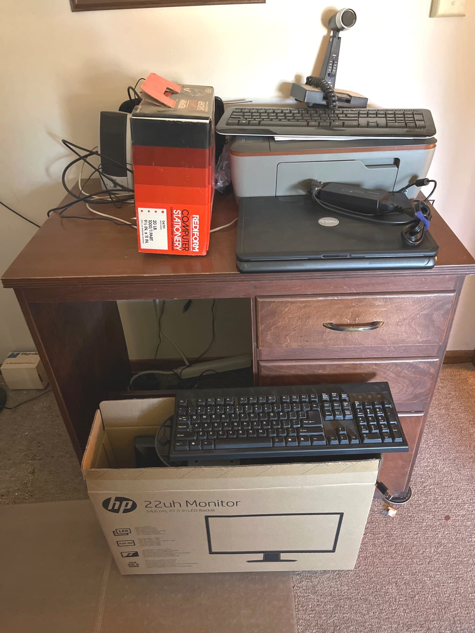 622 Computer Desk with Electronics Inc. Dell Laptop, HP Printer, and Accessories, 34.5x21x29?