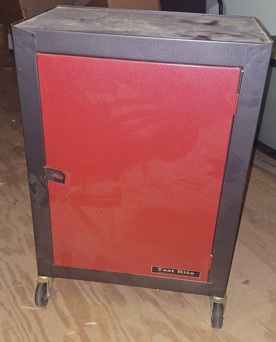 704 Metal Storage Cabinet on Casters with 2 Shelves and Red Door, 18x11x26?
