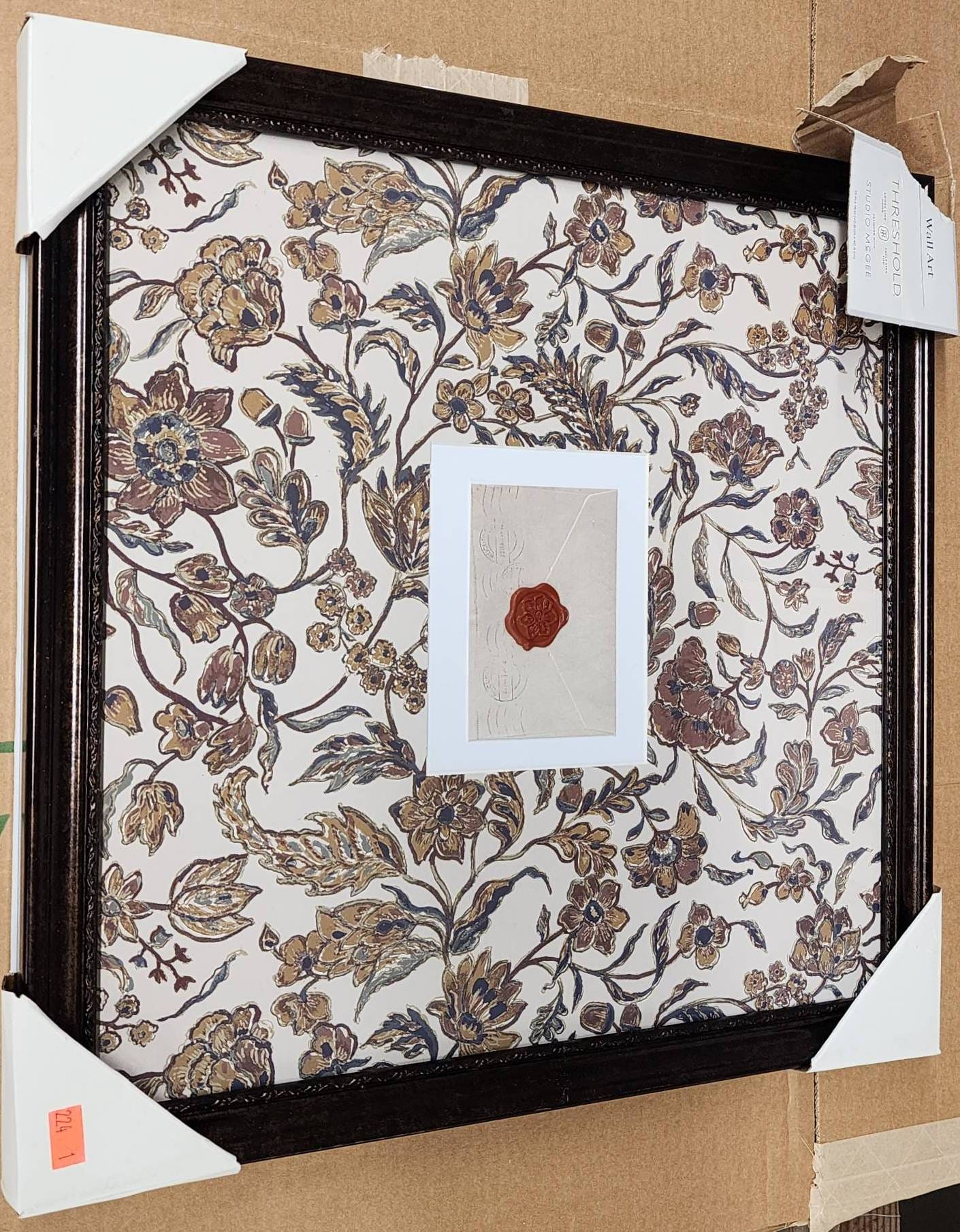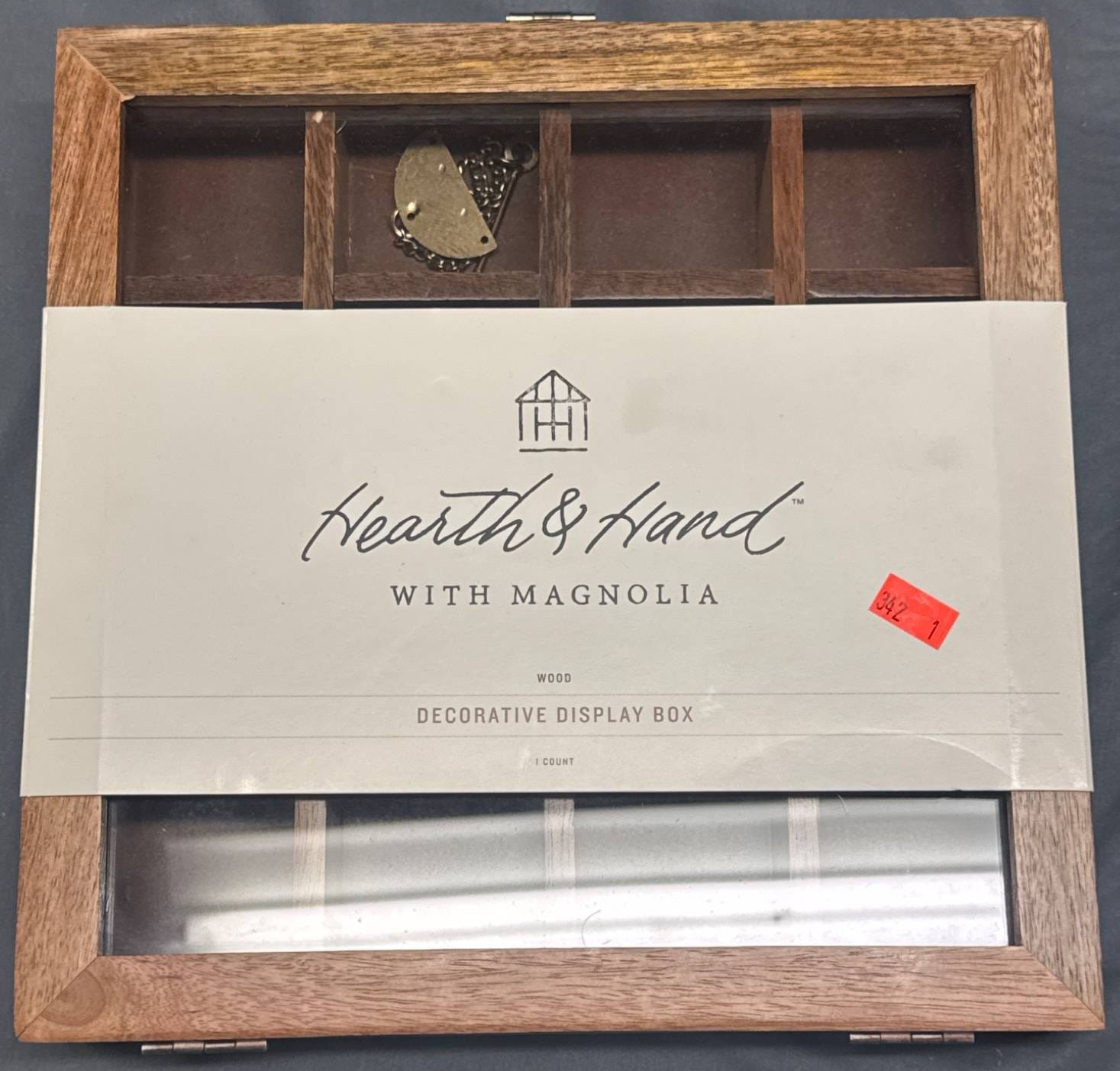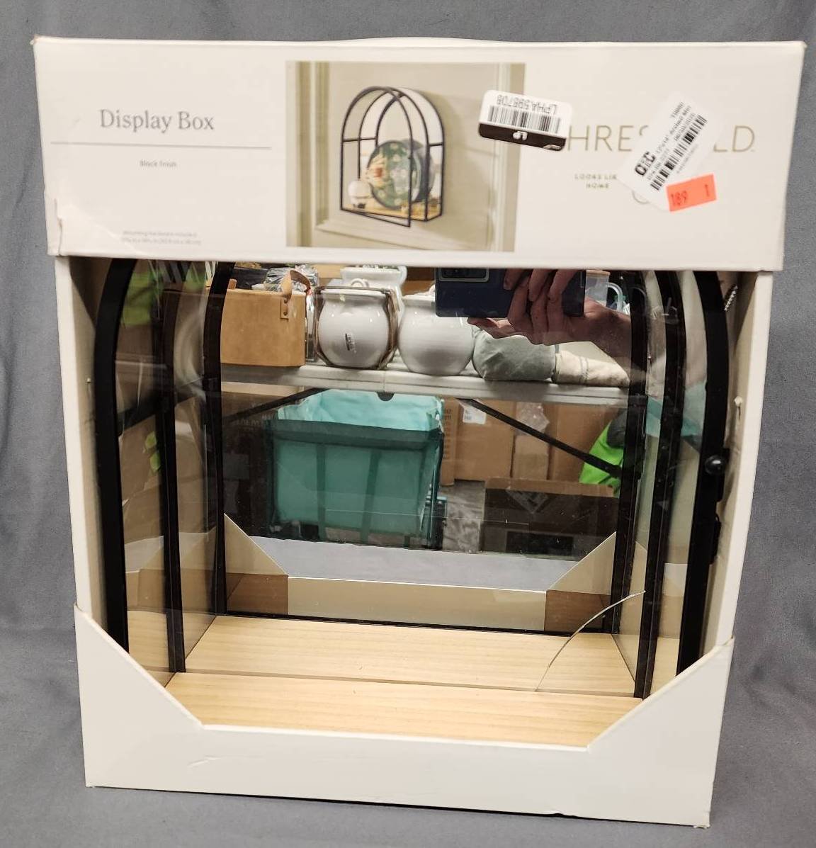 189 Glass Display Box with Black Frame and Wood Base, 12.8 x 14.9 In. Has a crack in glass panel sold as is