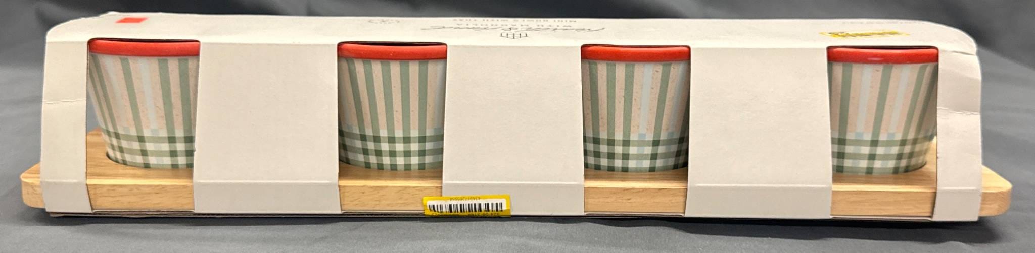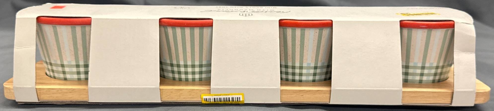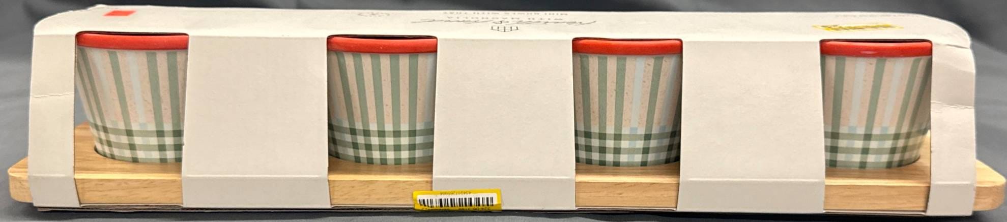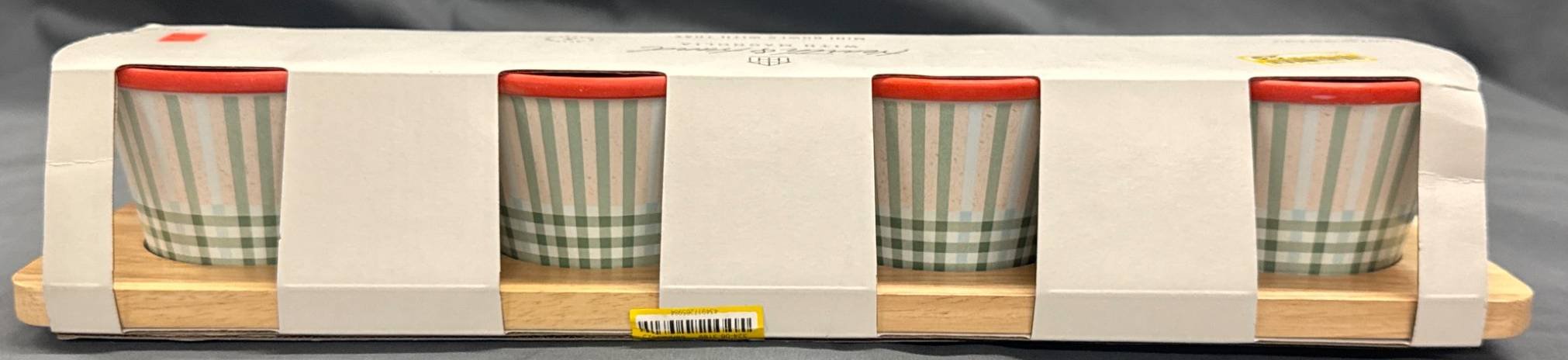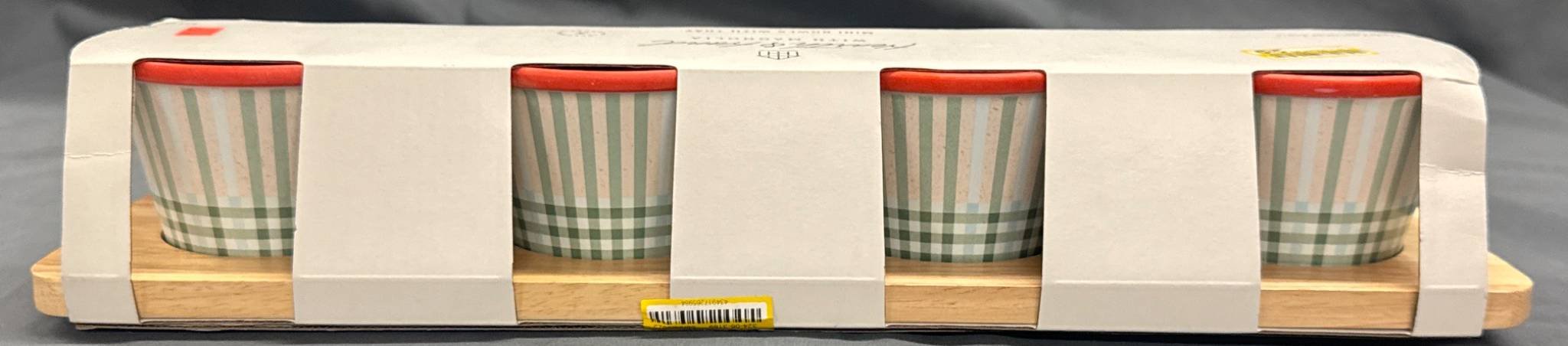 129 4-Piece ceramic planters, each 3? in height, with multicolored plaid design and terracotta rims.