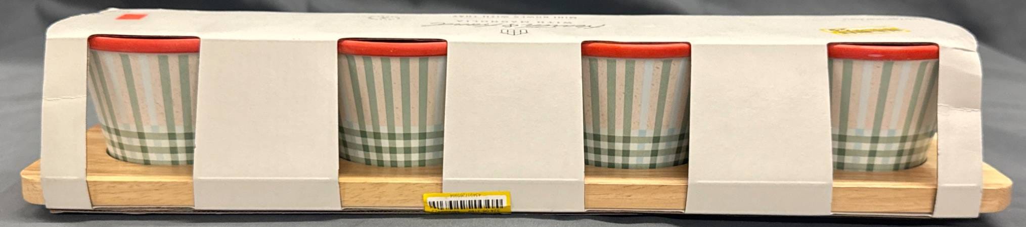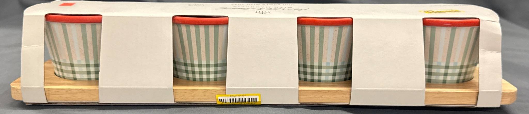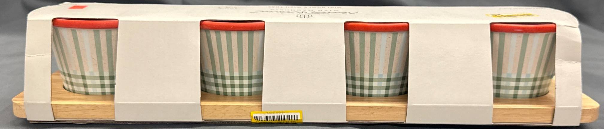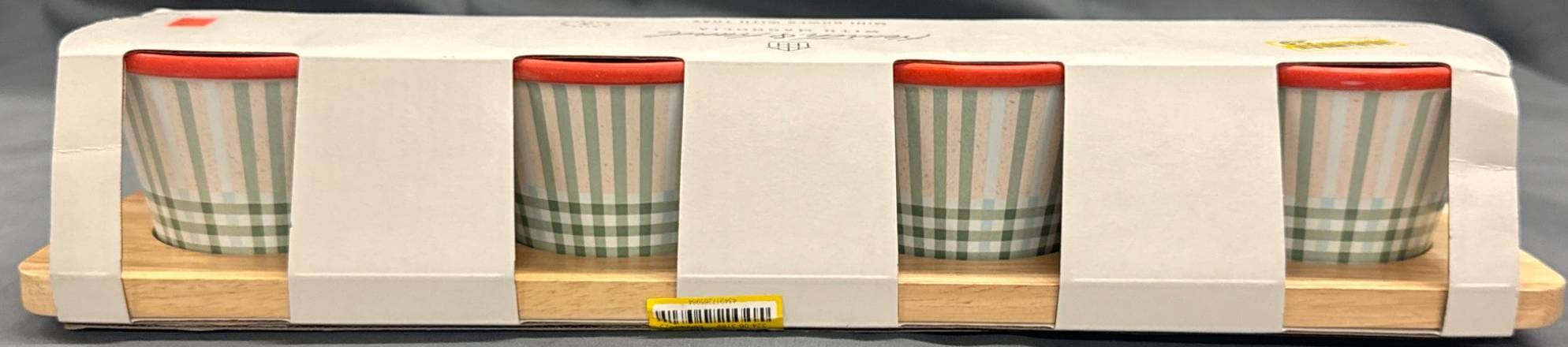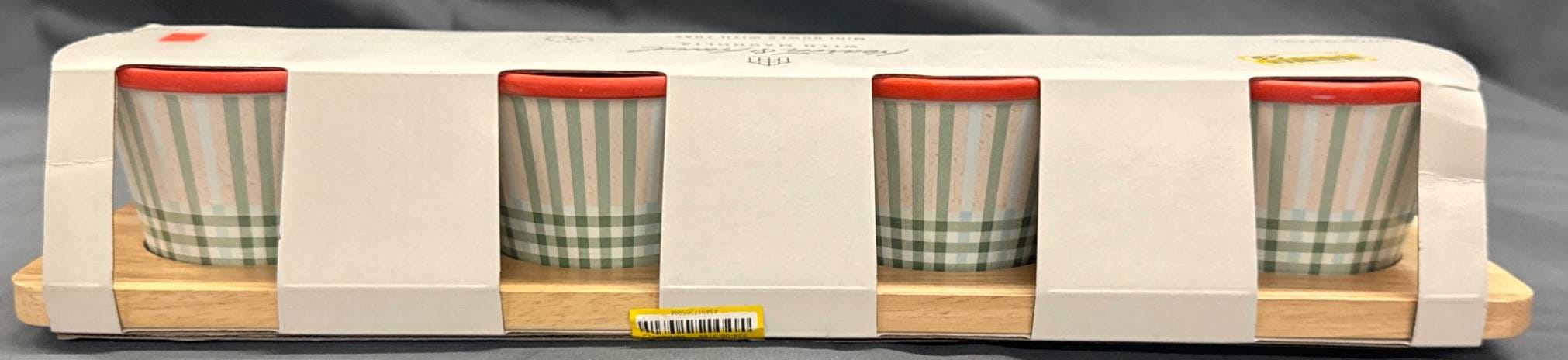 129 4-Piece ceramic planters, each 3? in height, with multicolored plaid design and terracotta rims.
