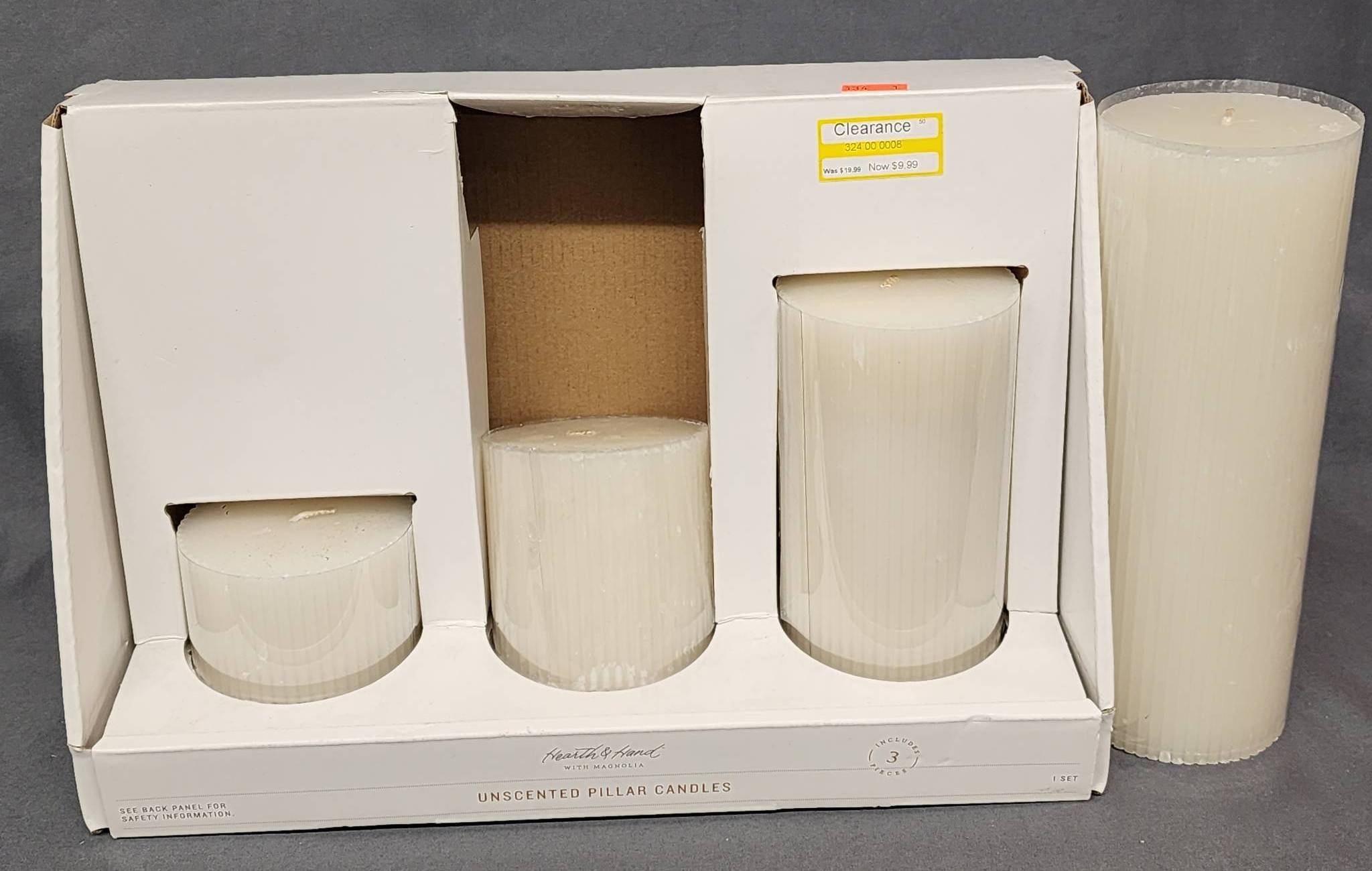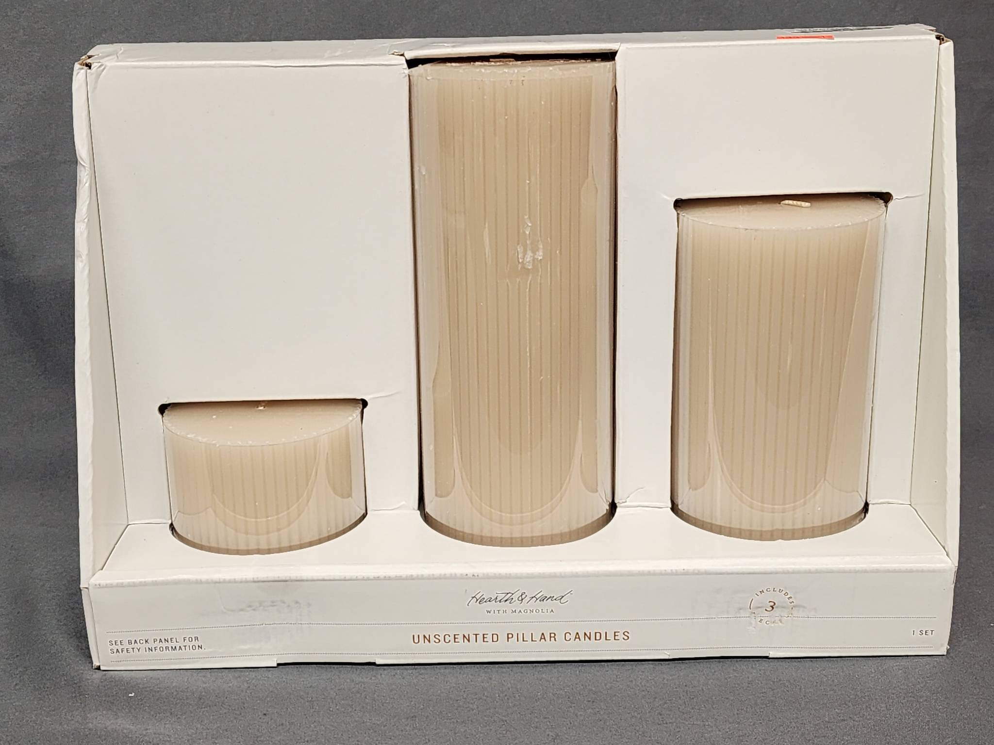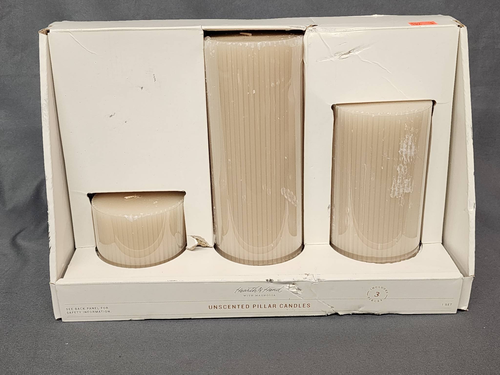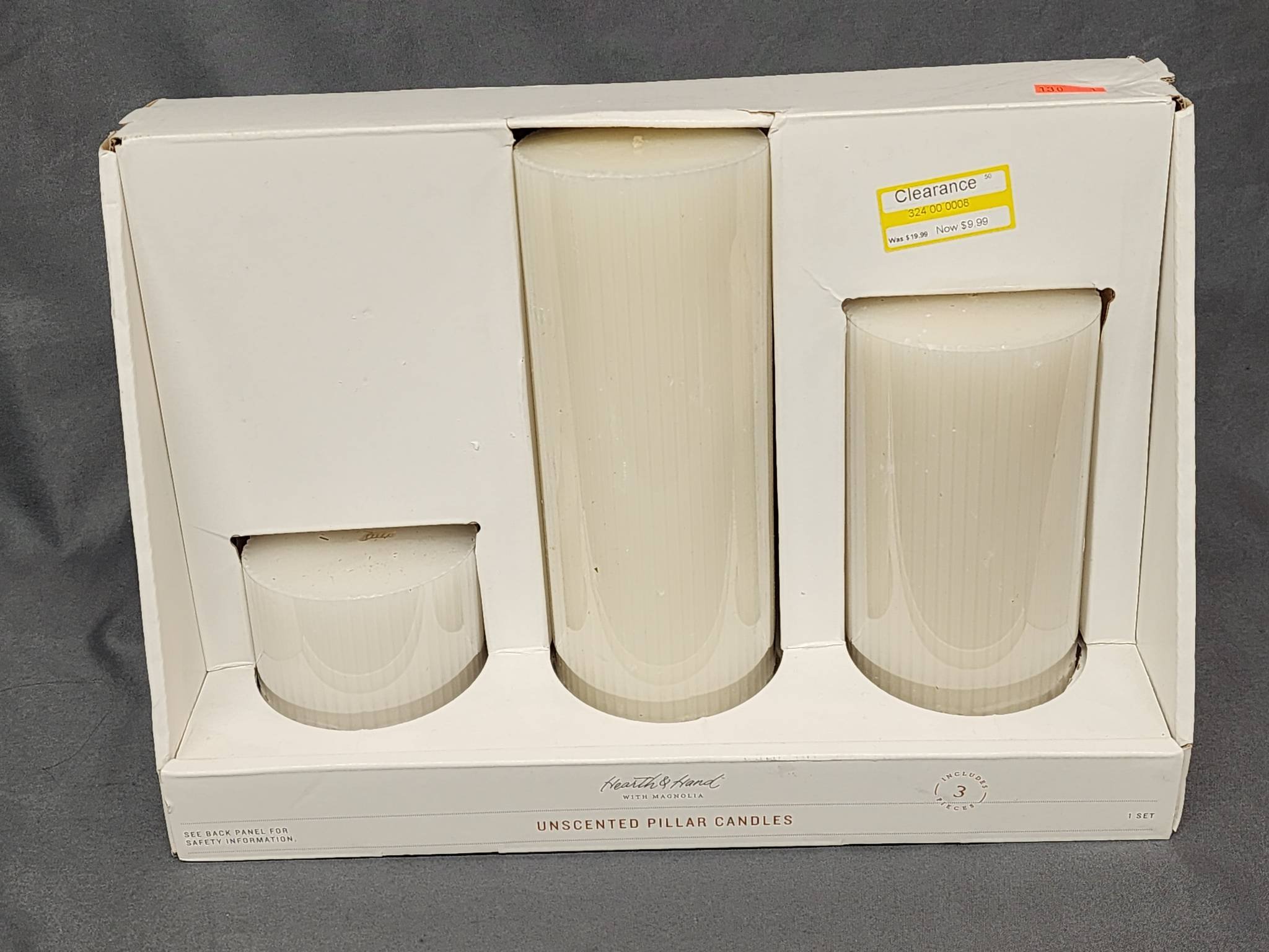 131 Hearth & Hand Inc. Magnolia Unscented Pillar Candles, Includes 3 in x 3 in, 6 in x 3 in, and 8 in x 3 in