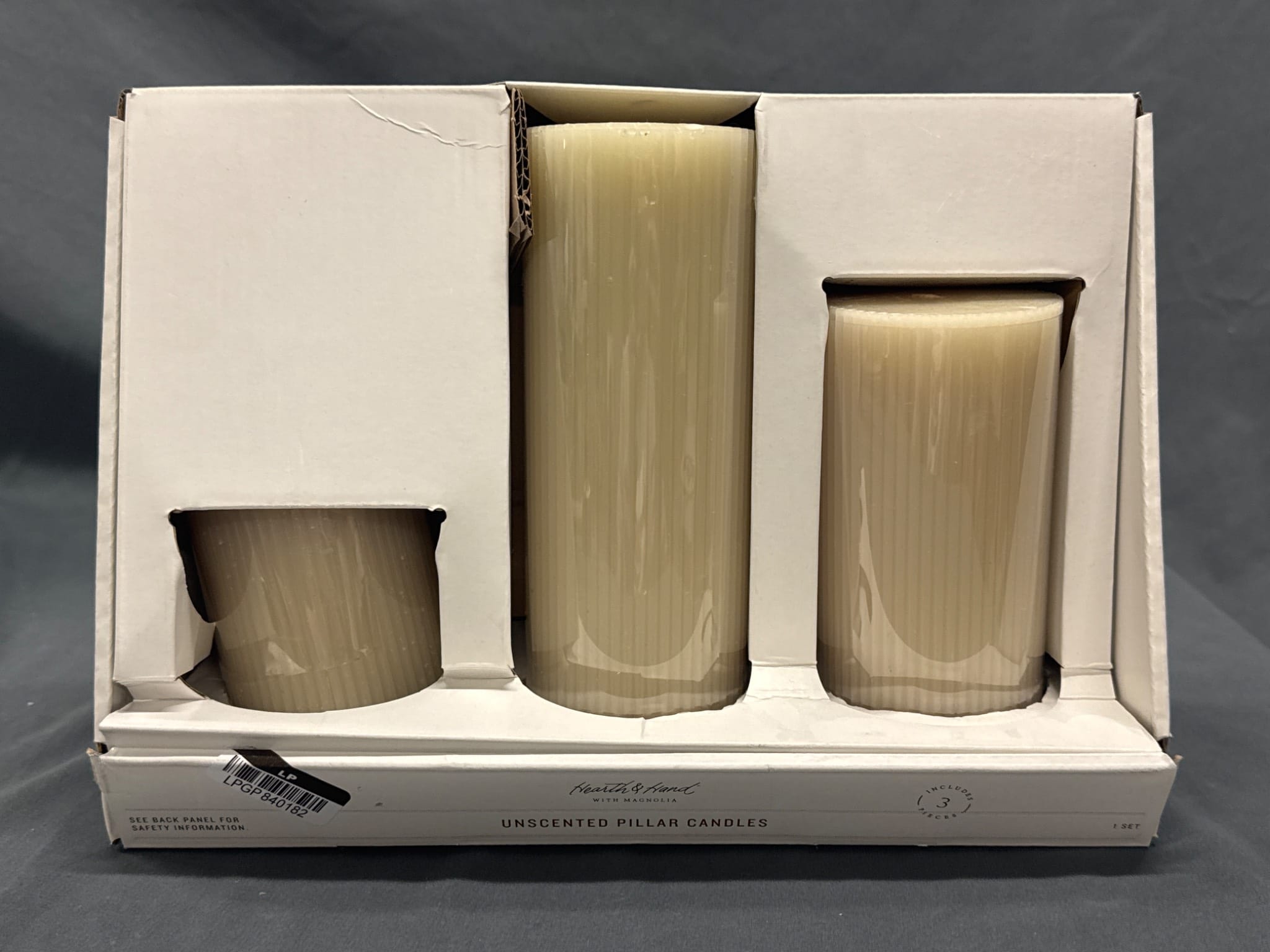 130 Hearth & Hand Inc. Magnolia Unscented Pillar Candles, Includes 3 in x 3 in, 6 in x 3 in, and 8 in x 3 in