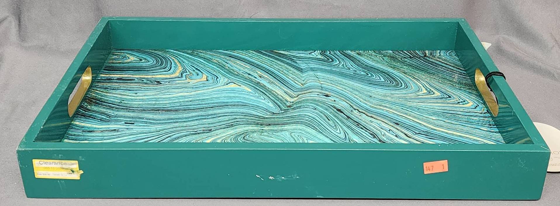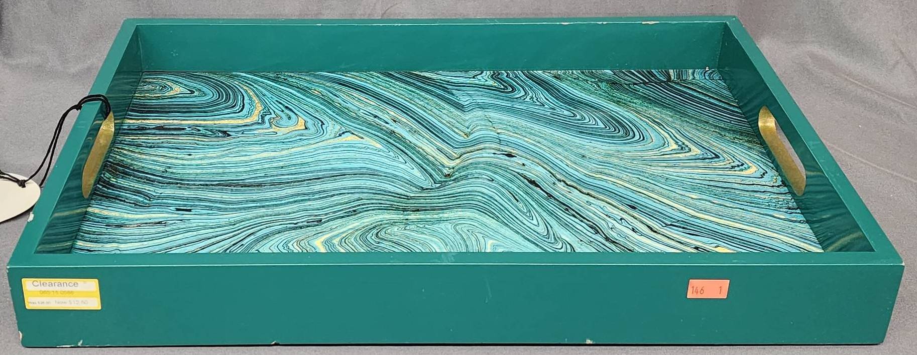 146 Threshold Tray with Blue and Gold Marbled Design, 18x12x2 In.has scuffing on edge and bottom of tray