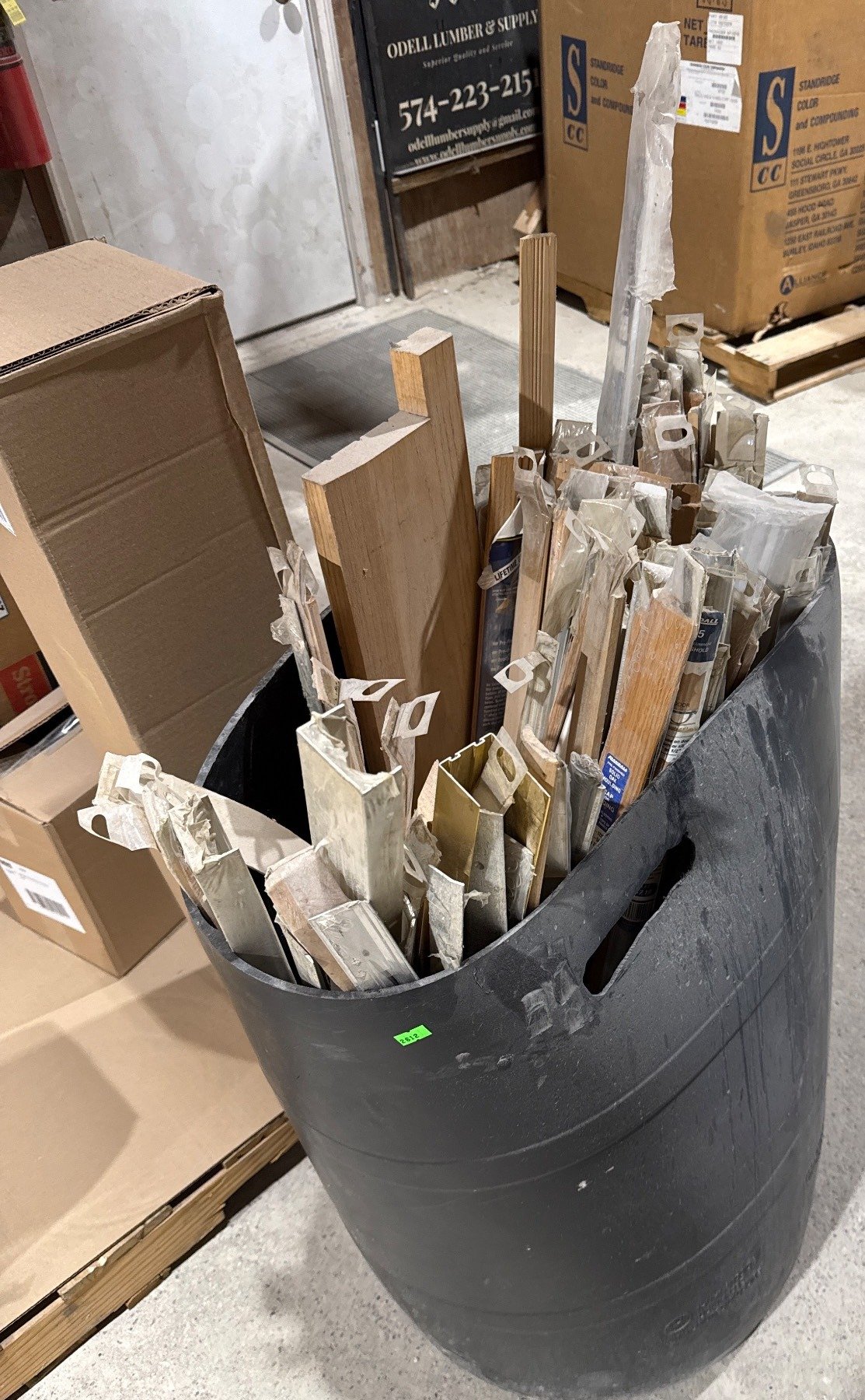 2612 Black Plastic Barrel Containing Assorted Pre-Finished Oak Moulding Trim Pieces