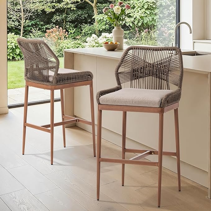 571049 IDZO - IDZO 400lbs Capacity Boho Rope Bar Stools Set of 2, 31 Inches Bar Height Stools with Cushions, Sturdy Aluminum Base, Ergonomic C
