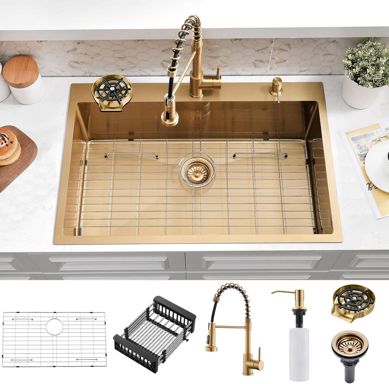 571070 SOMRXO - Drop In Kitchen Sink with Faucet Combo - Stainless Steel Gold Drop In Sink with Cup Washer, 9 Inch Deep Single Bowl Sinks and Fa - SEE PRODUCT DETAILS