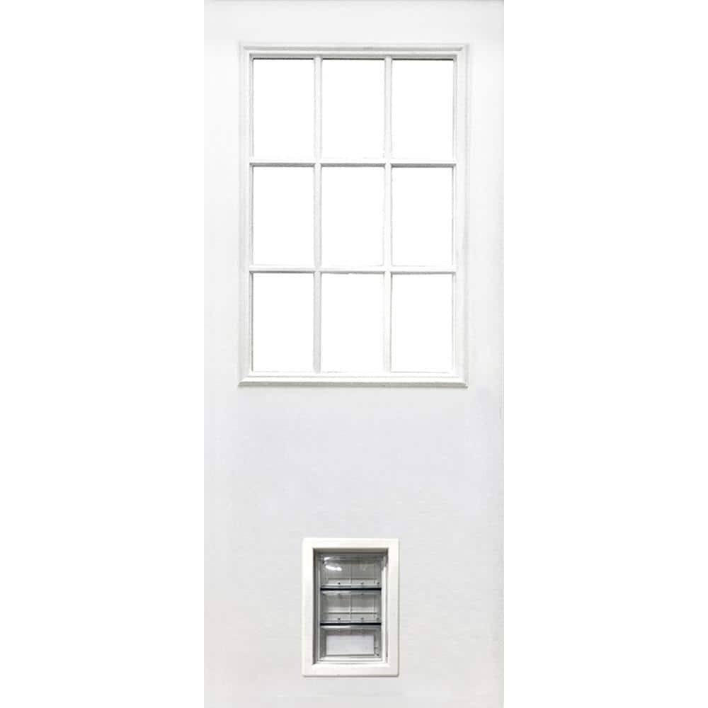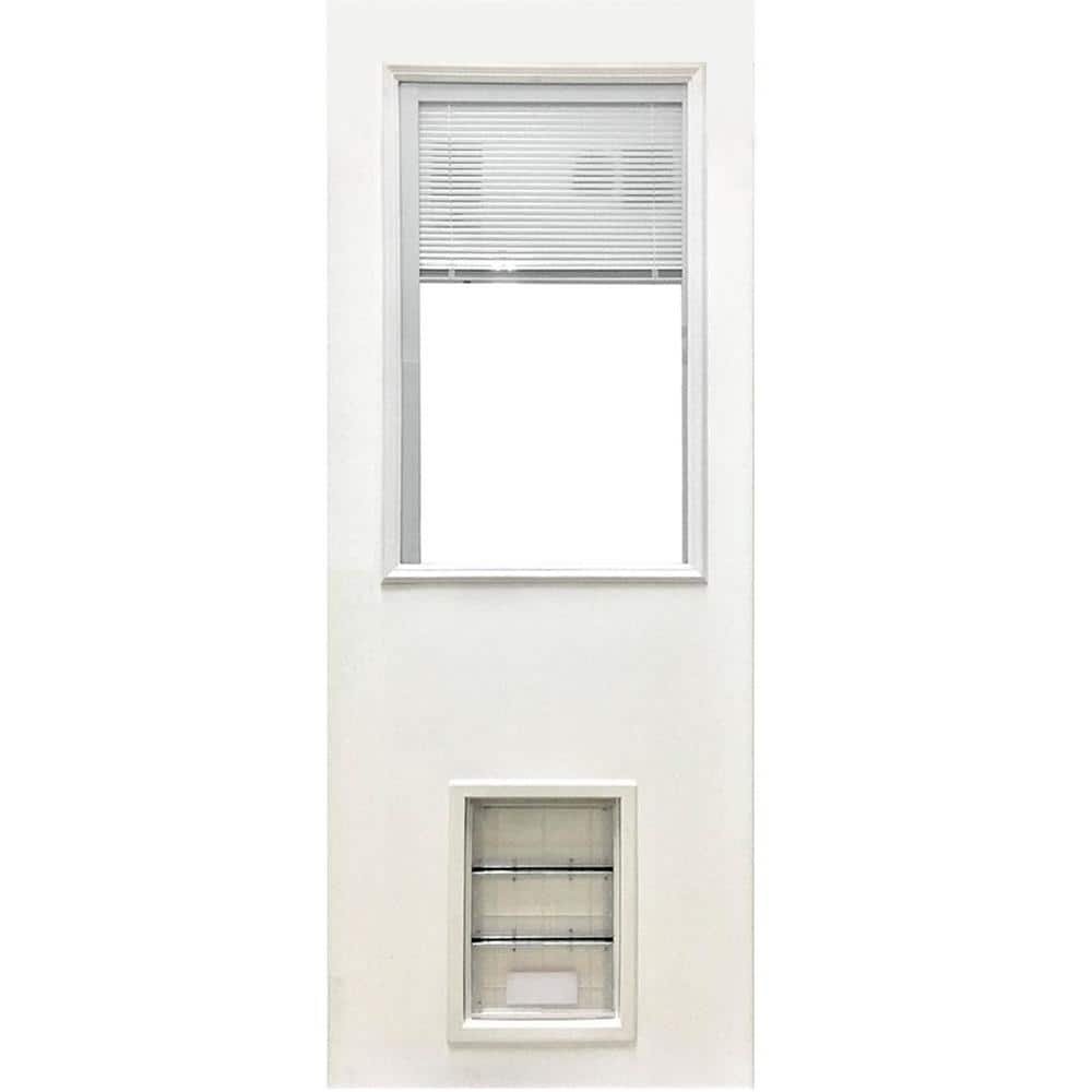 571033 STEVSONS - 31-3/4 in. x 79 in. Reliant Clear Half Lite Mini-Blind White Primed Fiberglass Front Door Slab with Large Pet Door